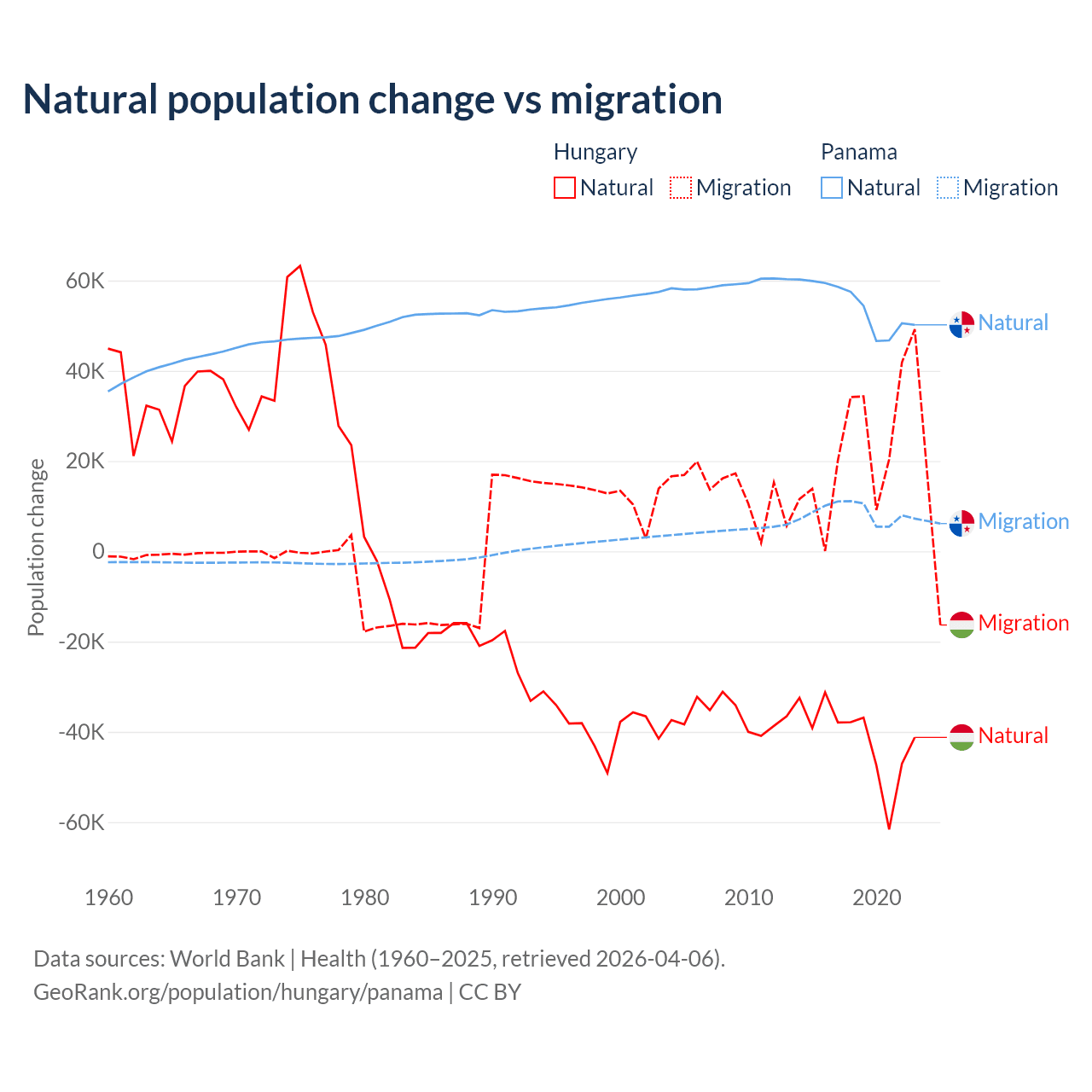 Over the last 10 years, 63.7% of the population change in Hungary is from natural causes (a loss of 412,838 people) and 36.3% is from migration (a gain of 234,837 people). In Panama 86.5% is from natural causes (a gain of 544,211 people) and 13.5% is from migration (a gain of 84,849 people).