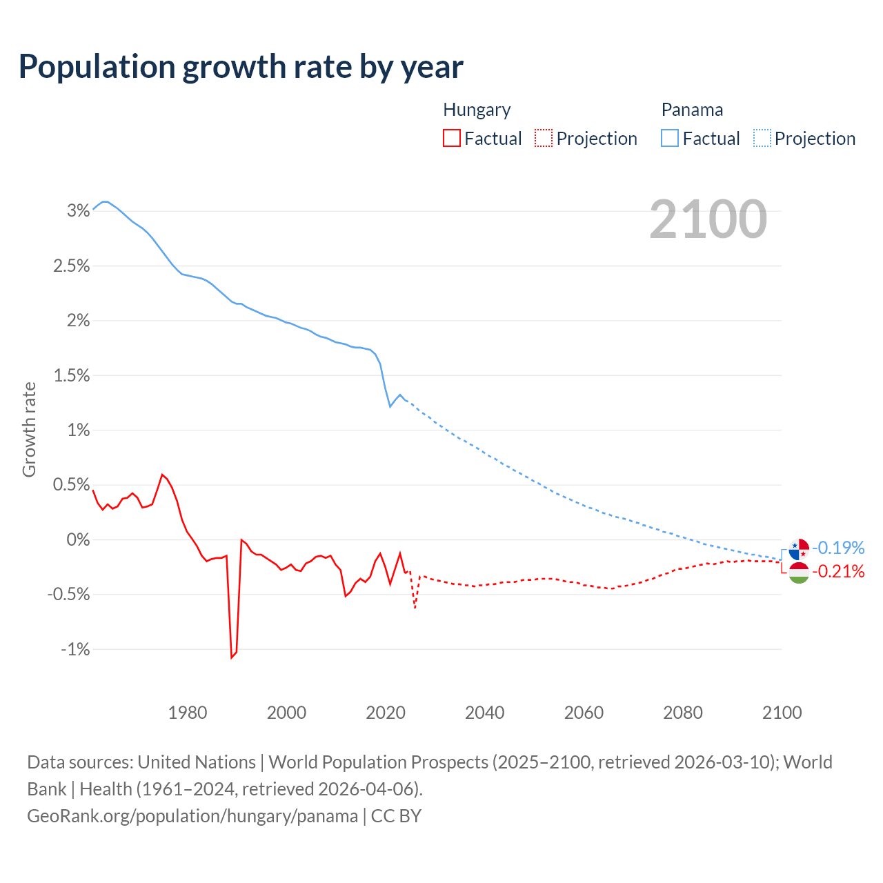 - For the last 10 years, Hungary has had an average growth rate of -0.29% per year vs +1.52% in Panama.