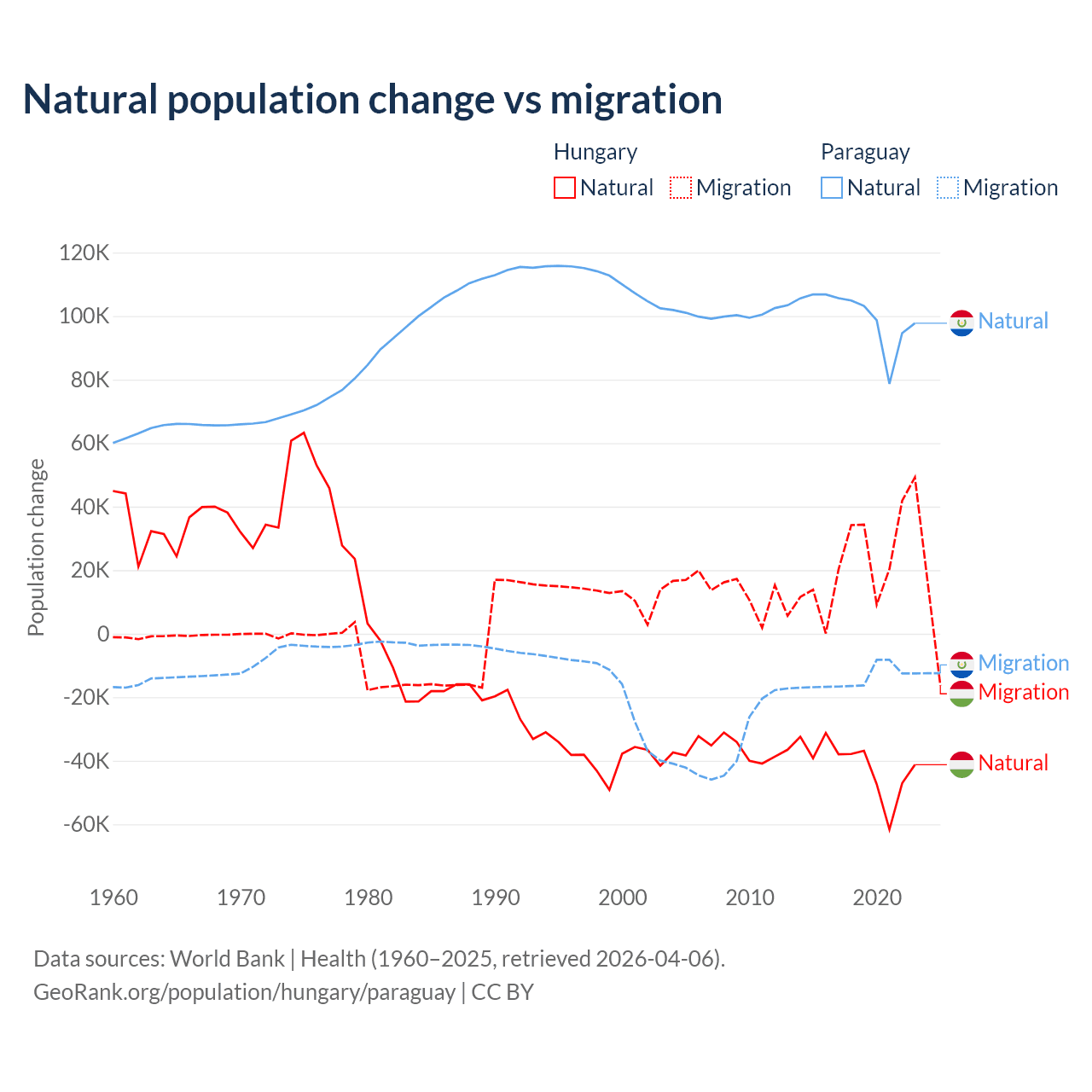 Over the last 10 years, 63.7% of the population change in Hungary is from natural causes (a loss of 412,838 people) and 36.3% is from migration (a gain of 234,837 people). In Paraguay 87.6% is from natural causes (a gain of 1,002,636 people) and 12.4% is from migration (a loss of 141,377 people).
