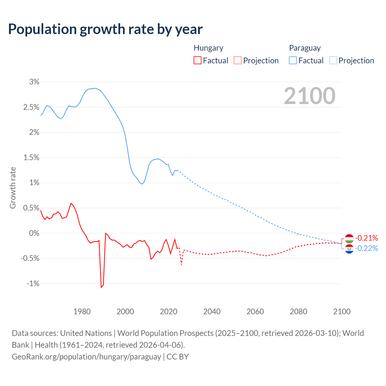 - For the last 10 years, Hungary has had an average growth rate of -0.29% per year vs +1.34% in Paraguay.
