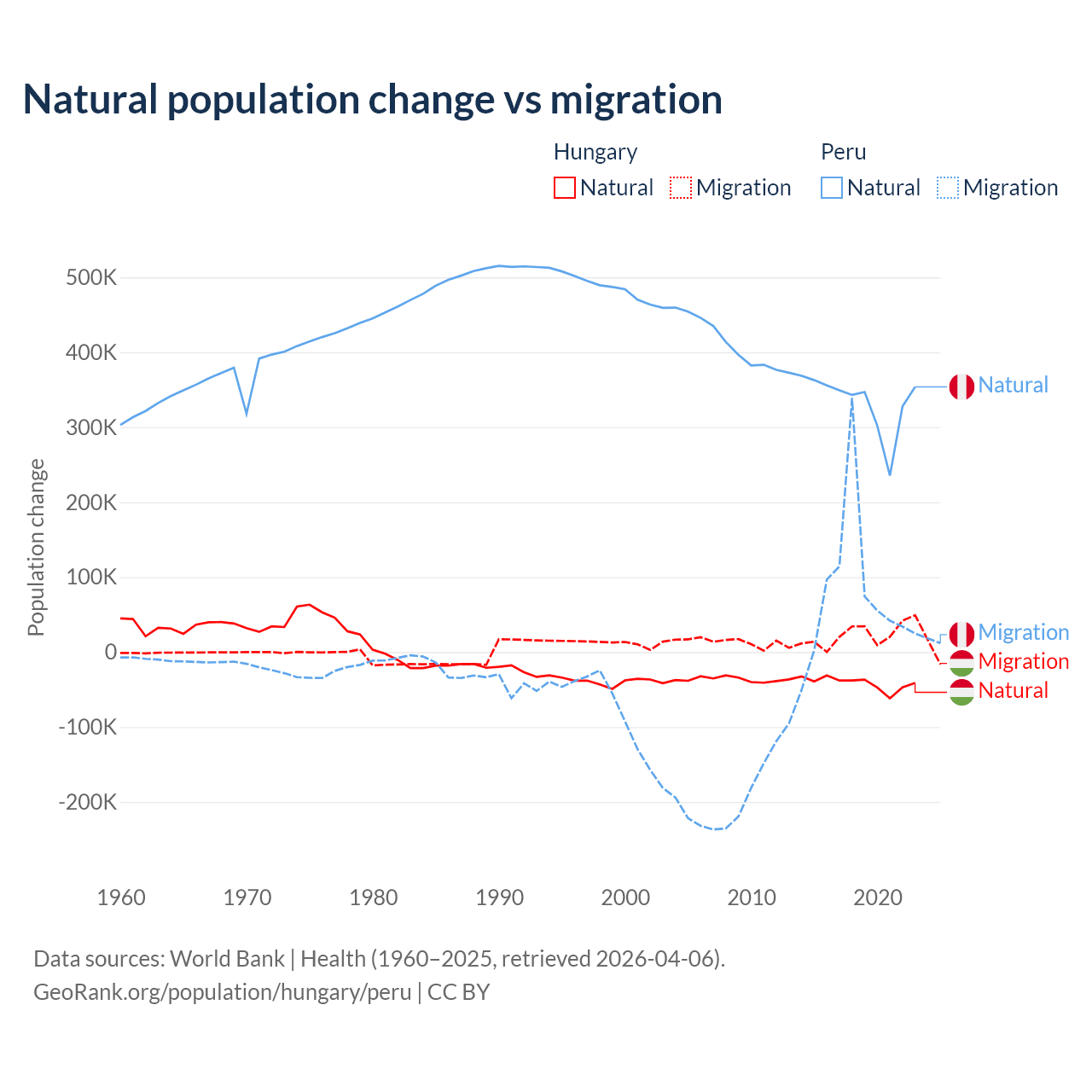 Over the last 10 years, 63.7% of the population change in Hungary is from natural causes (a loss of 412,838 people) and 36.3% is from migration (a gain of 234,837 people). In Peru 82% is from natural causes (a gain of 3,345,822 people) and 18% is from migration (a gain of 732,505 people).