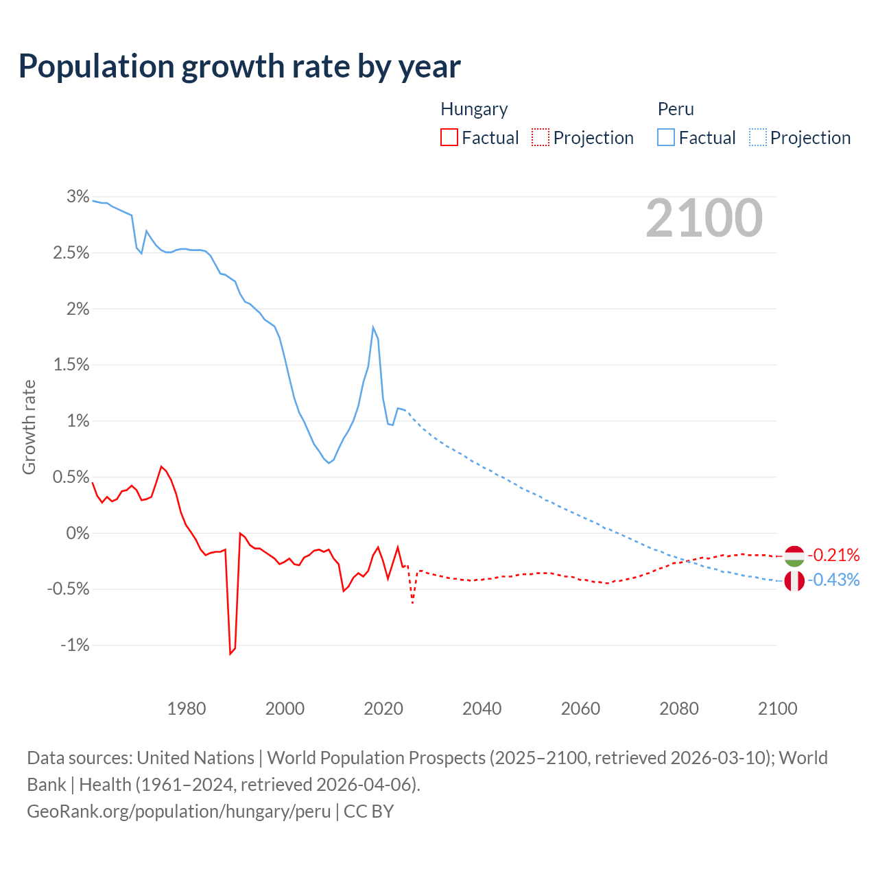 - For the last 10 years, Hungary has had an average growth rate of -0.29% per year vs +1.26% in Peru.