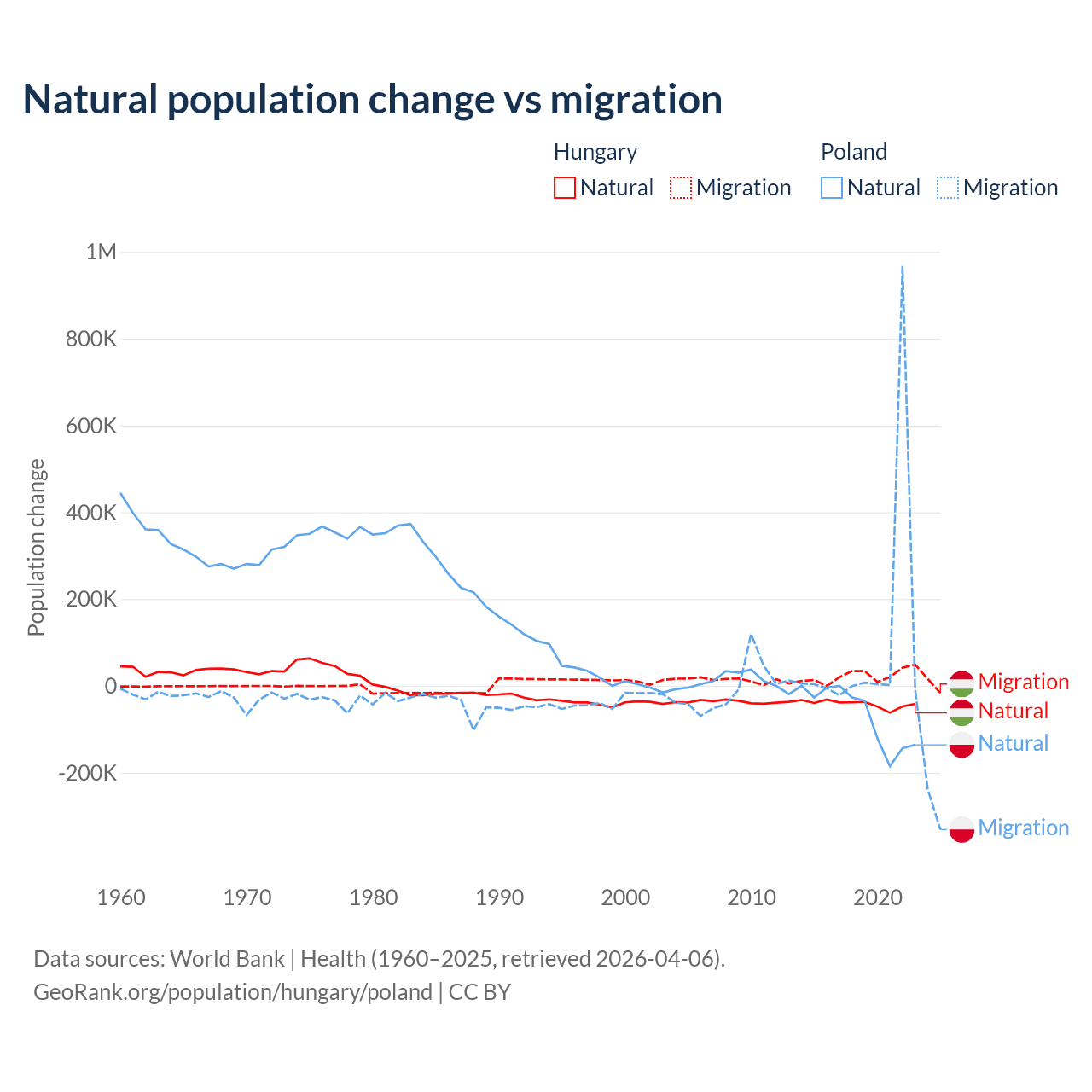 Over the last 10 years, 63.7% of the population change in Hungary is from natural causes (a loss of 412,838 people) and 36.3% is from migration (a gain of 234,837 people). In Poland 41.4% is from natural causes (a loss of 675,443 people) and 58.6% is from migration (a gain of 955,766 people).