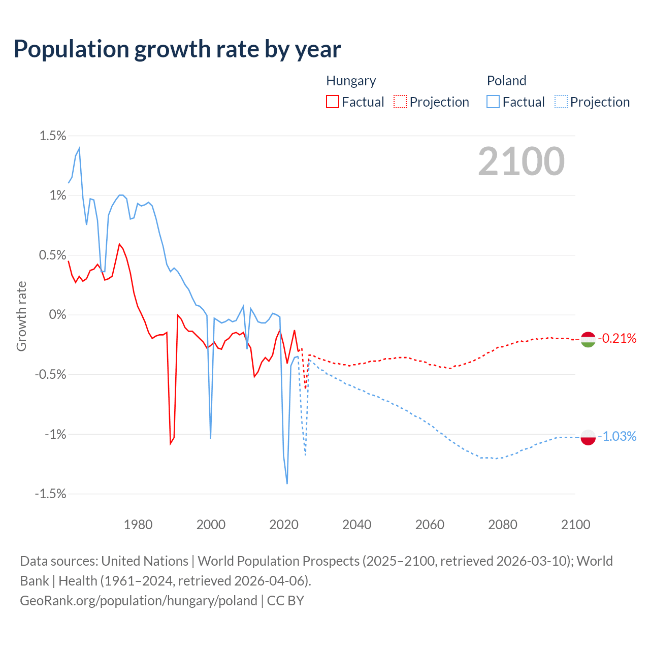 - For the last 10 years, Hungary has had an average growth rate of -0.29% per year vs -0.36% in Poland.