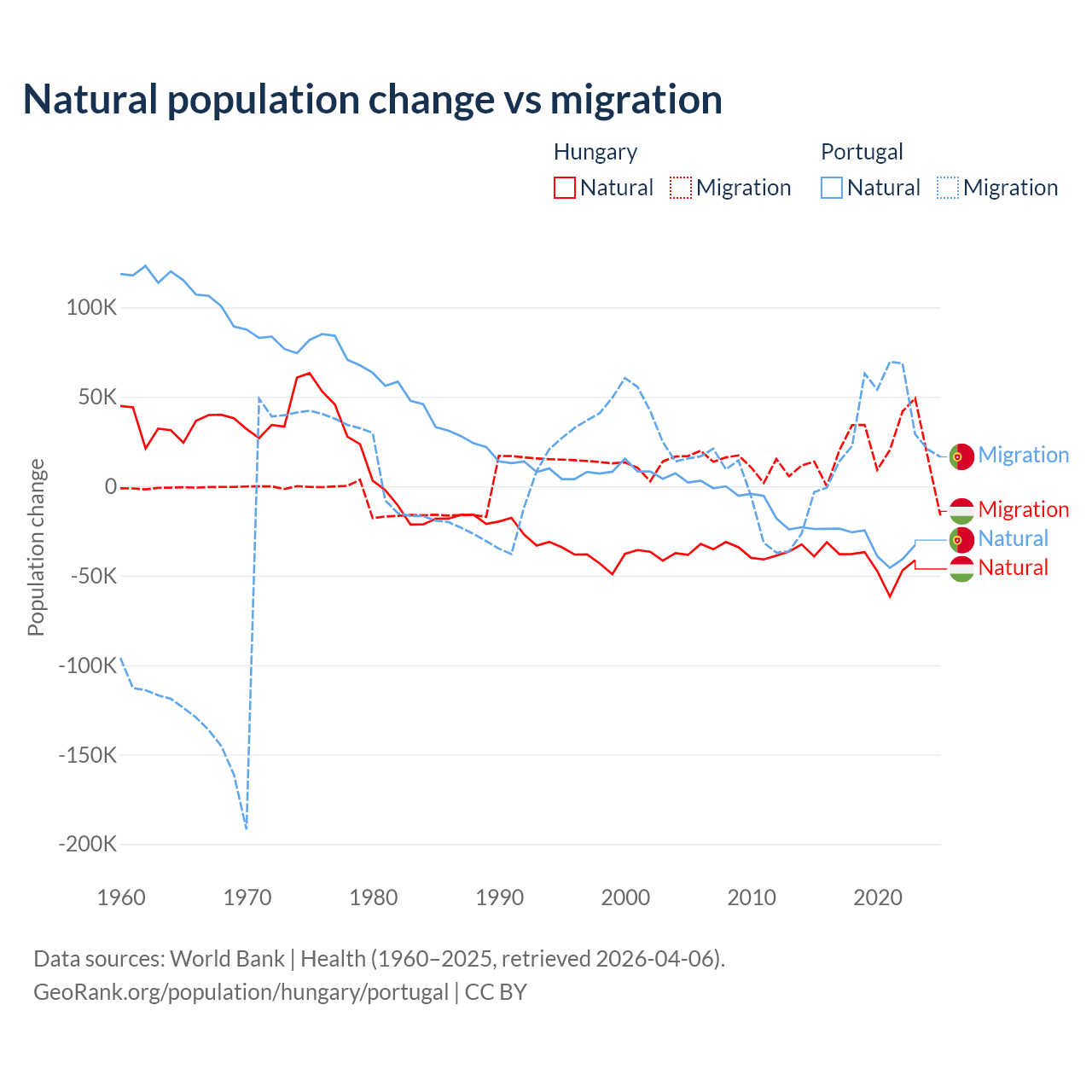 Over the last 10 years, 63.7% of the population change in Hungary is from natural causes (a loss of 412,838 people) and 36.3% is from migration (a gain of 234,837 people). In Portugal 51% is from natural causes (a loss of 302,748 people) and 49% is from migration (a gain of 290,554 people).