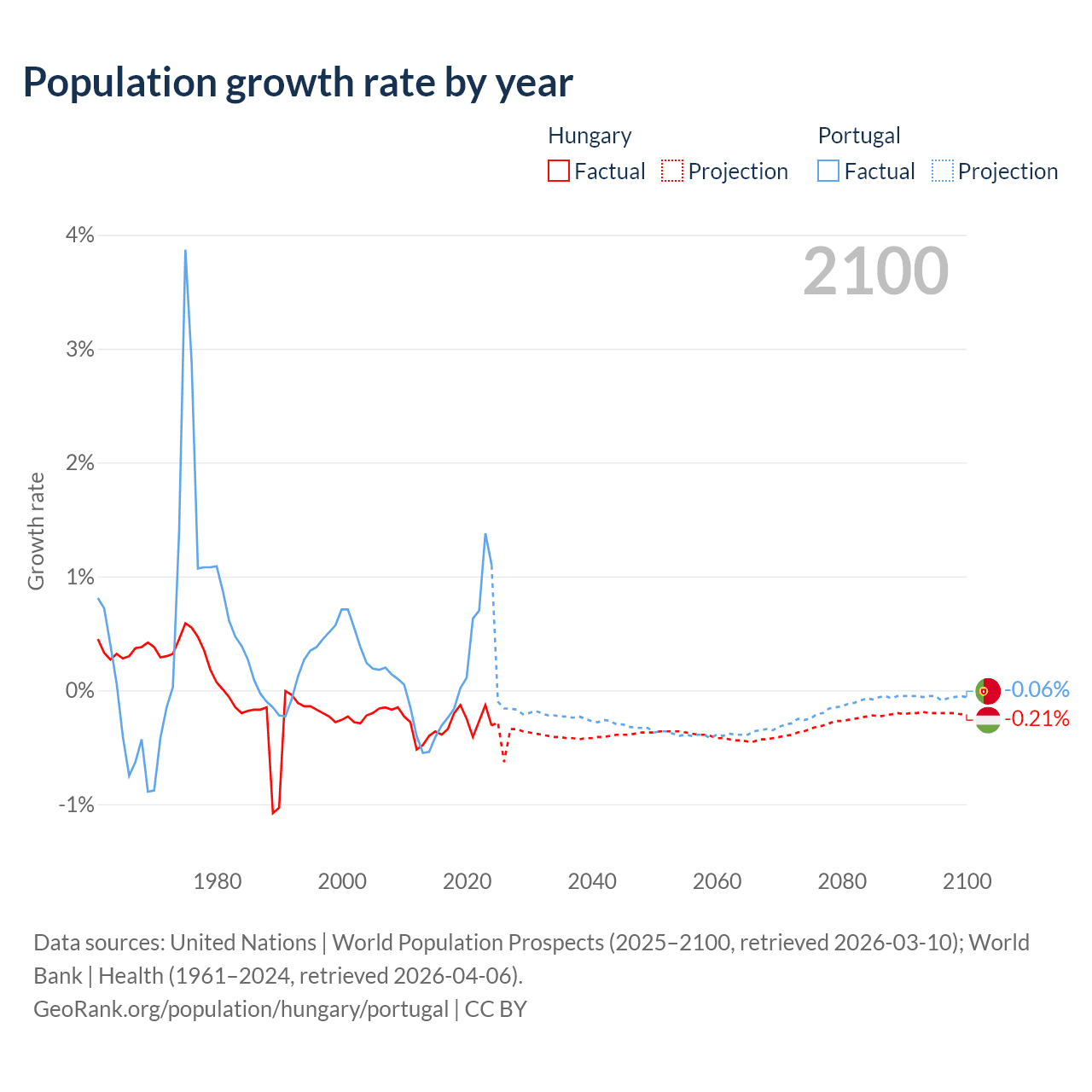 - For the last 10 years, Hungary has had an average growth rate of -0.29% per year vs +0.21% in Portugal.