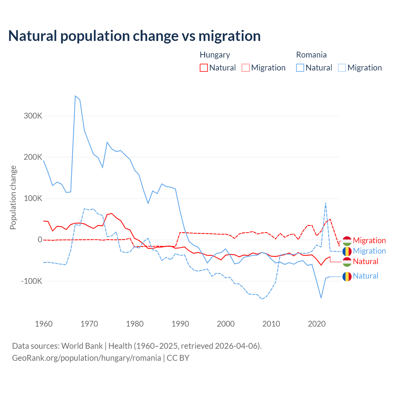 Over the last 10 years, 63.7% of the population change in Hungary is from natural causes (a loss of 412,838 people) and 36.3% is from migration (a gain of 234,837 people). In Romania 82% is from natural causes (a loss of 766,295 people) and 18% is from migration (a loss of 167,917 people).