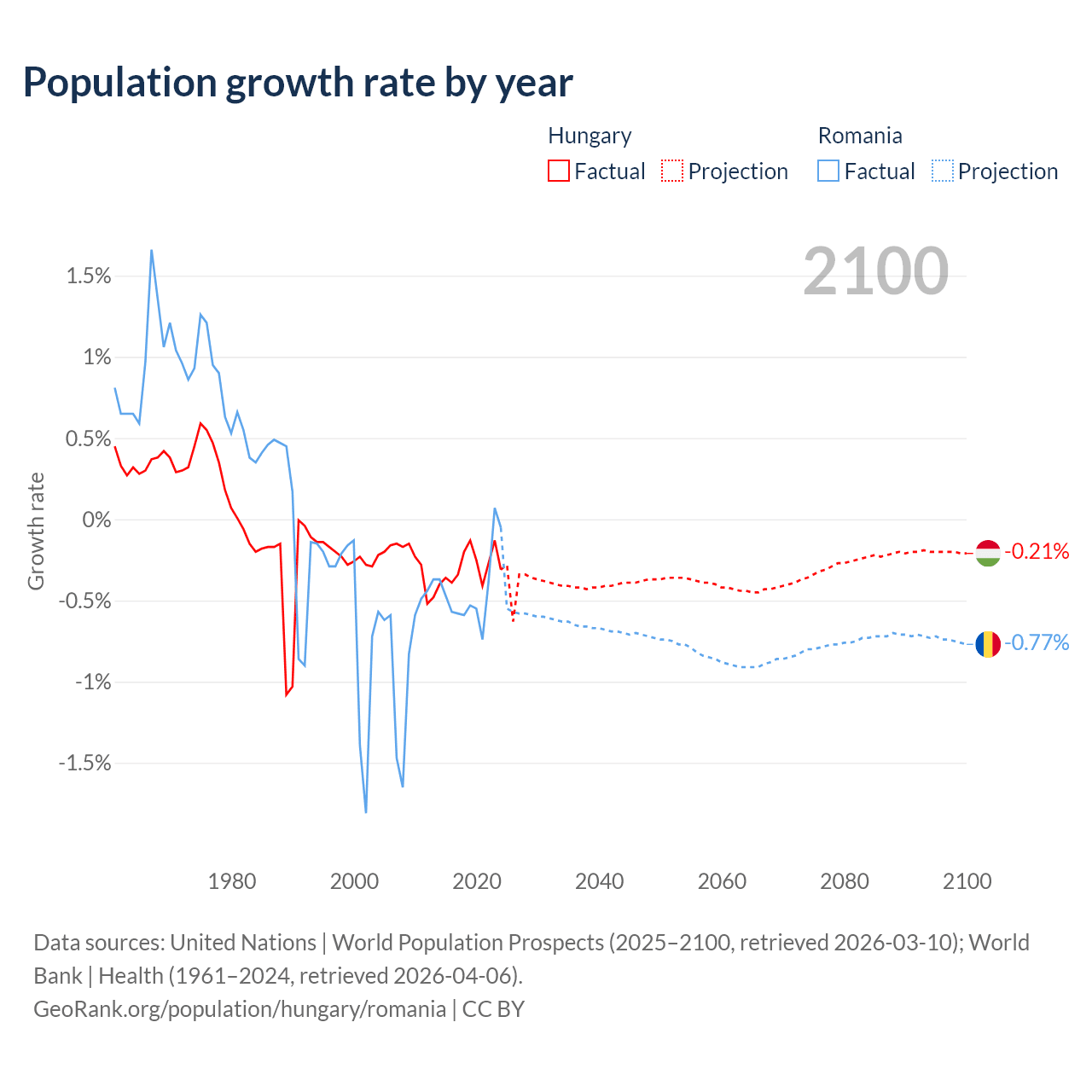 - For the last 10 years, Hungary has had an average growth rate of -0.29% per year vs -0.43% in Romania.