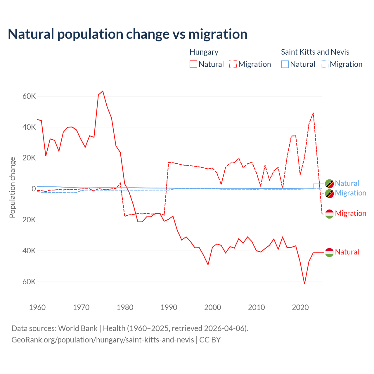 Over the last 10 years, 63.7% of the population change in Hungary is from natural causes (a loss of 412,838 people) and 36.3% is from migration (a gain of 234,837 people). In Saint Kitts and Nevis 44.9% is from natural causes (a gain of 1,225 people) and 55.1% is from migration (a loss of 1,506 people).