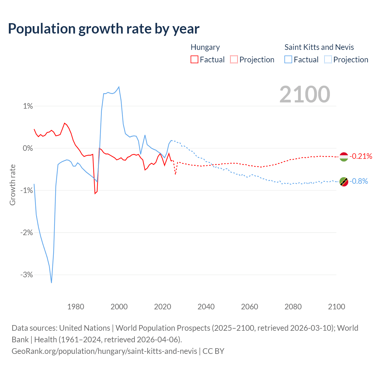 - For the last 10 years, Hungary has had an average growth rate of -0.29% per year vs -0.04% in Saint Kitts and Nevis.