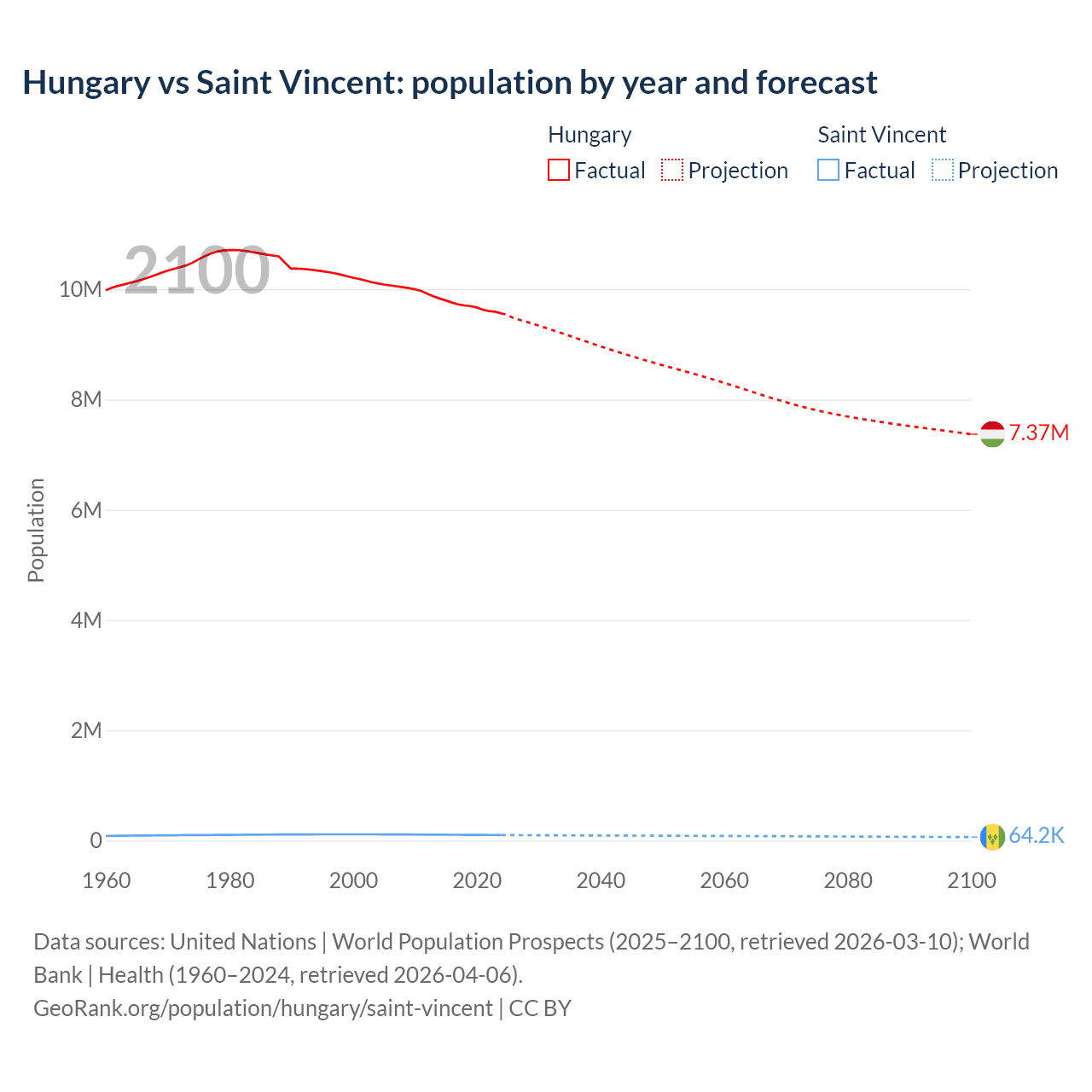 The latest officially reported population of Hungary was 9,562,065 in 2024 vs 100,616 people in Saint Vincent in 2024. In 2026, based on the adjusted UN estimation, the current Hungary's population is 9,475,525 people compared to 99,237 in Saint Vincent.