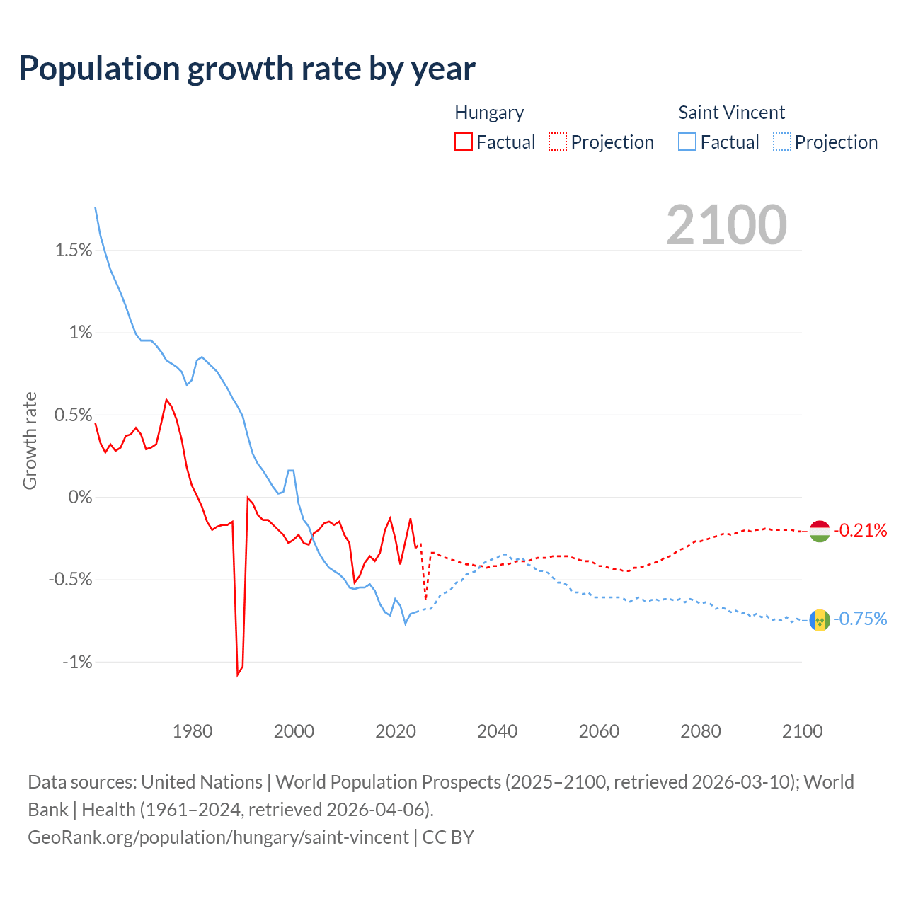 - For the last 10 years, Hungary has had an average growth rate of -0.29% per year vs -0.65% in Saint Vincent.