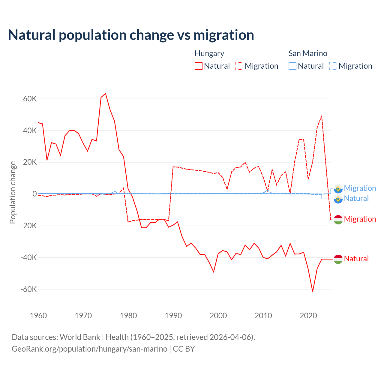 Over the last 10 years, 63.7% of the population change in Hungary is from natural causes (a loss of 412,838 people) and 36.3% is from migration (a gain of 234,837 people). In San Marino 40.9% is from natural causes (a loss of 358 people) and 59.1% is from migration (a gain of 517 people).