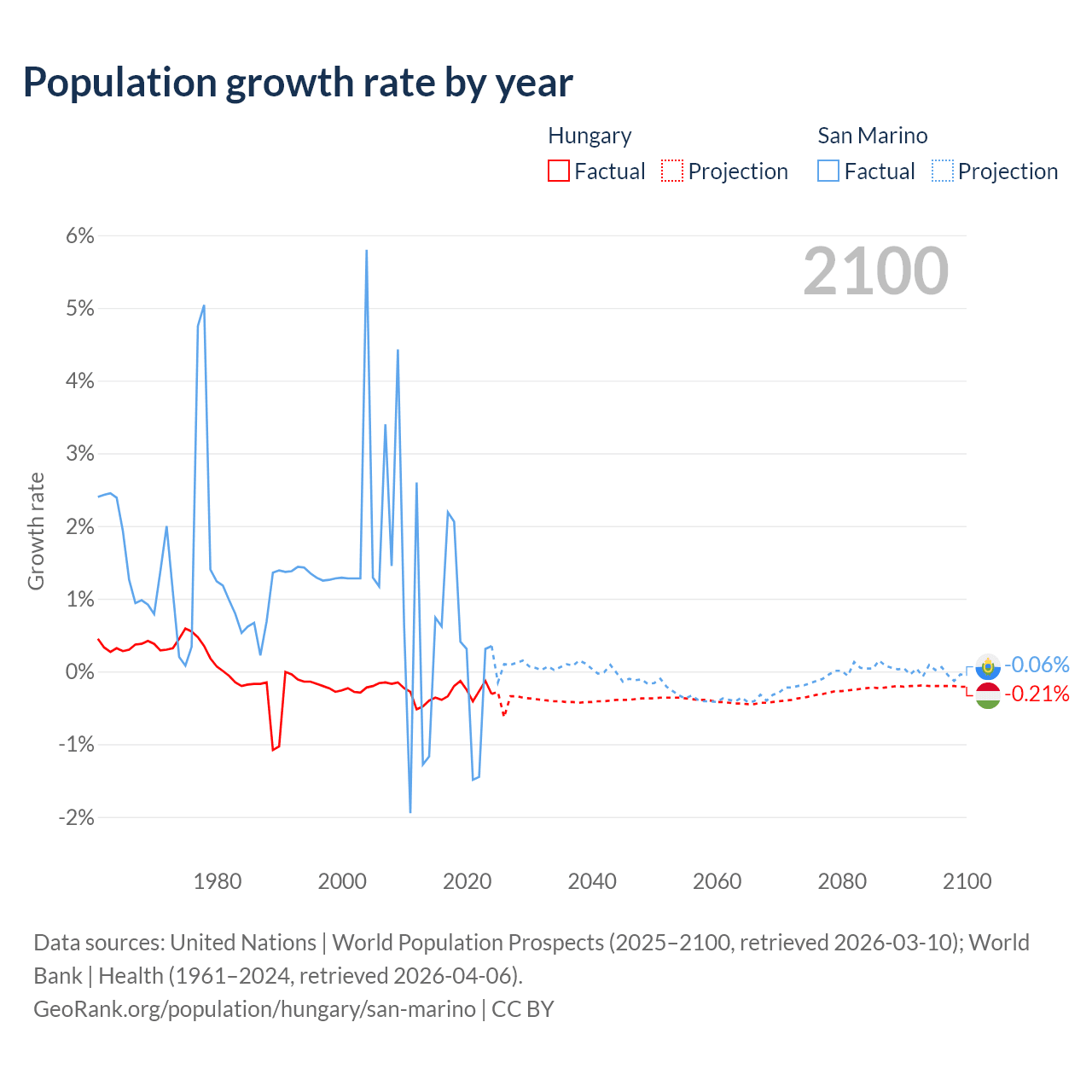 - For the last 10 years, Hungary has had an average growth rate of -0.29% per year vs +0.26% in San Marino.