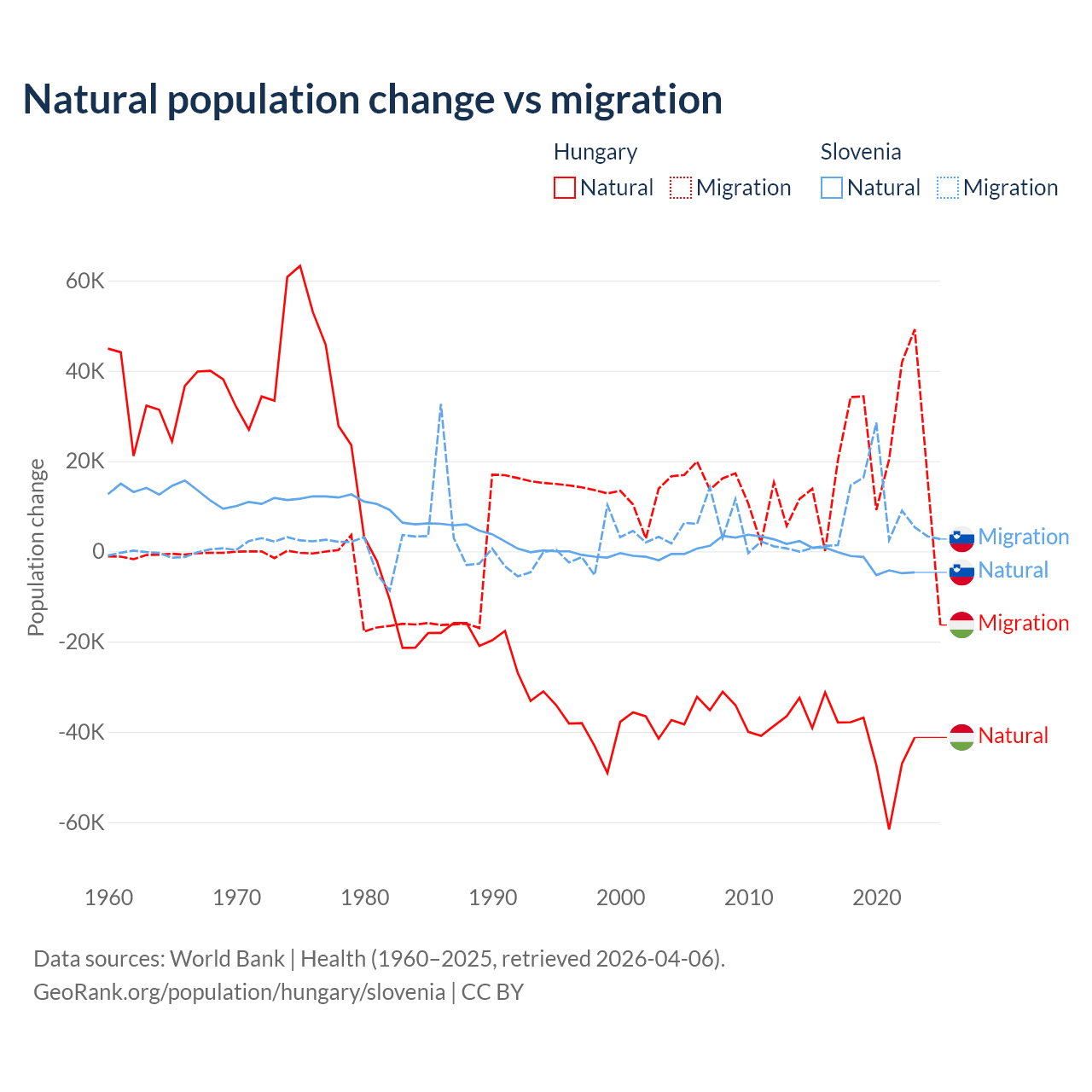 Over the last 10 years, 63.7% of the population change in Hungary is from natural causes (a loss of 412,838 people) and 36.3% is from migration (a gain of 234,837 people). In Slovenia 18.1% is from natural causes (a loss of 17,573 people) and 81.9% is from migration (a gain of 79,532 people).