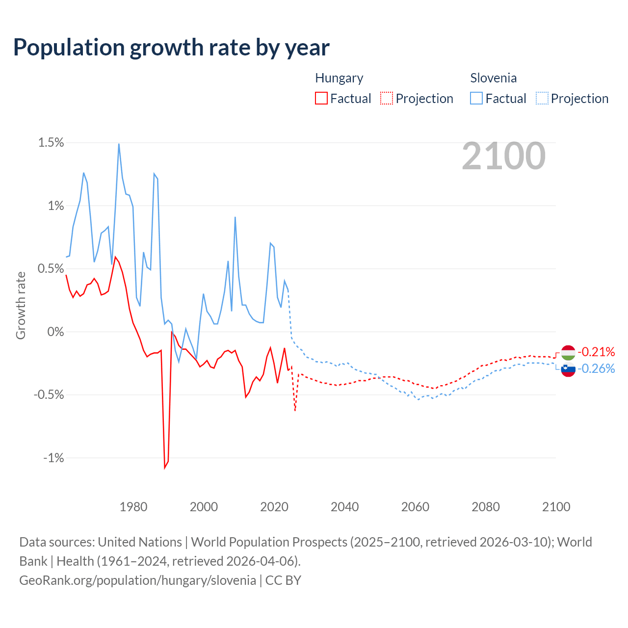 - For the last 10 years, Hungary has had an average growth rate of -0.29% per year vs +0.29% in Slovenia.