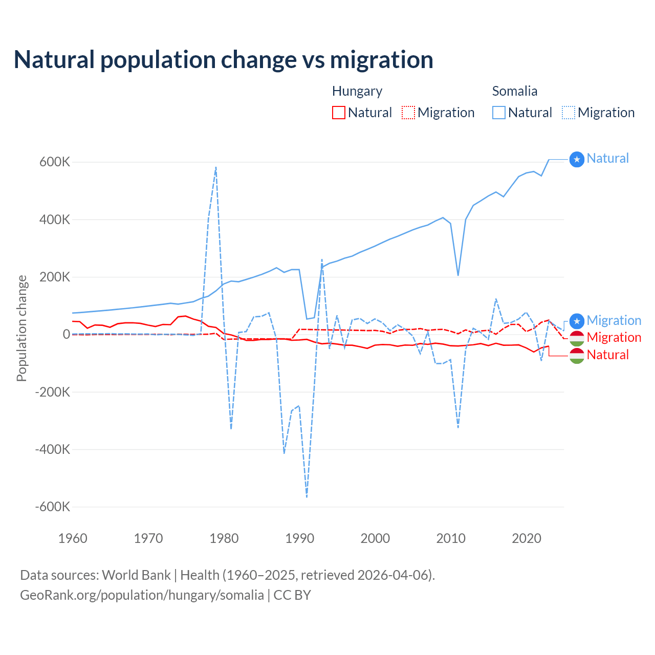Over the last 10 years, 63.7% of the population change in Hungary is from natural causes (a loss of 412,838 people) and 36.3% is from migration (a gain of 234,837 people). In Somalia 94.4% is from natural causes (a gain of 5,270,105 people) and 5.58% is from migration (a gain of 311,487 people).