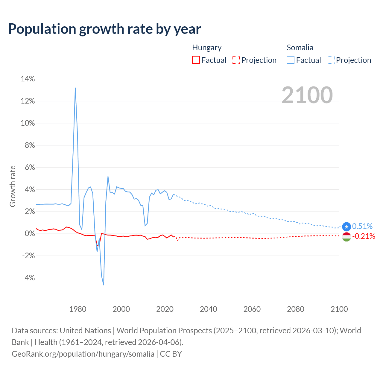 - For the last 10 years, Hungary has had an average growth rate of -0.29% per year vs +3.61% in Somalia.