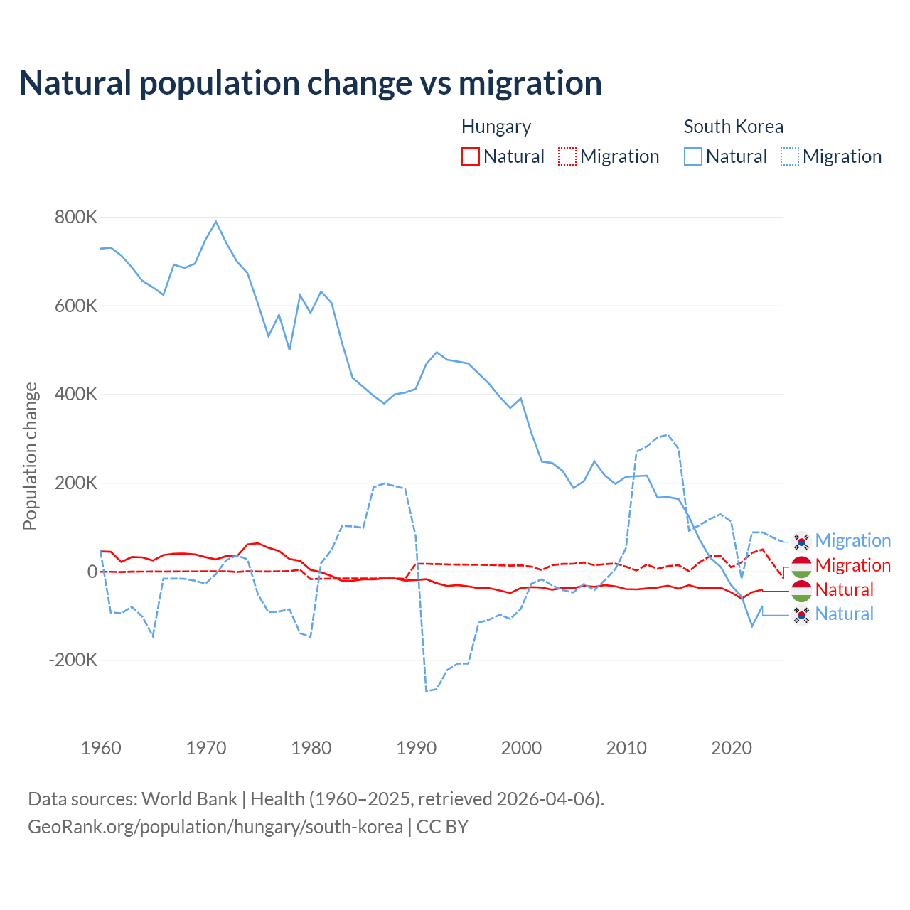 Over the last 10 years, 63.7% of the population change in Hungary is from natural causes (a loss of 412,838 people) and 36.3% is from migration (a gain of 234,837 people). In South Korea 17.6% is from natural causes (a gain of 277,215 people) and 82.4% is from migration (a gain of 1,298,356 people).