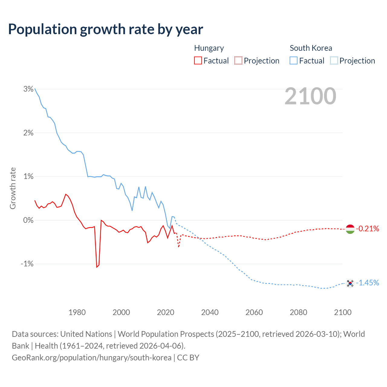 - For the last 10 years, Hungary has had an average growth rate of -0.29% per year vs +0.24% in South Korea.