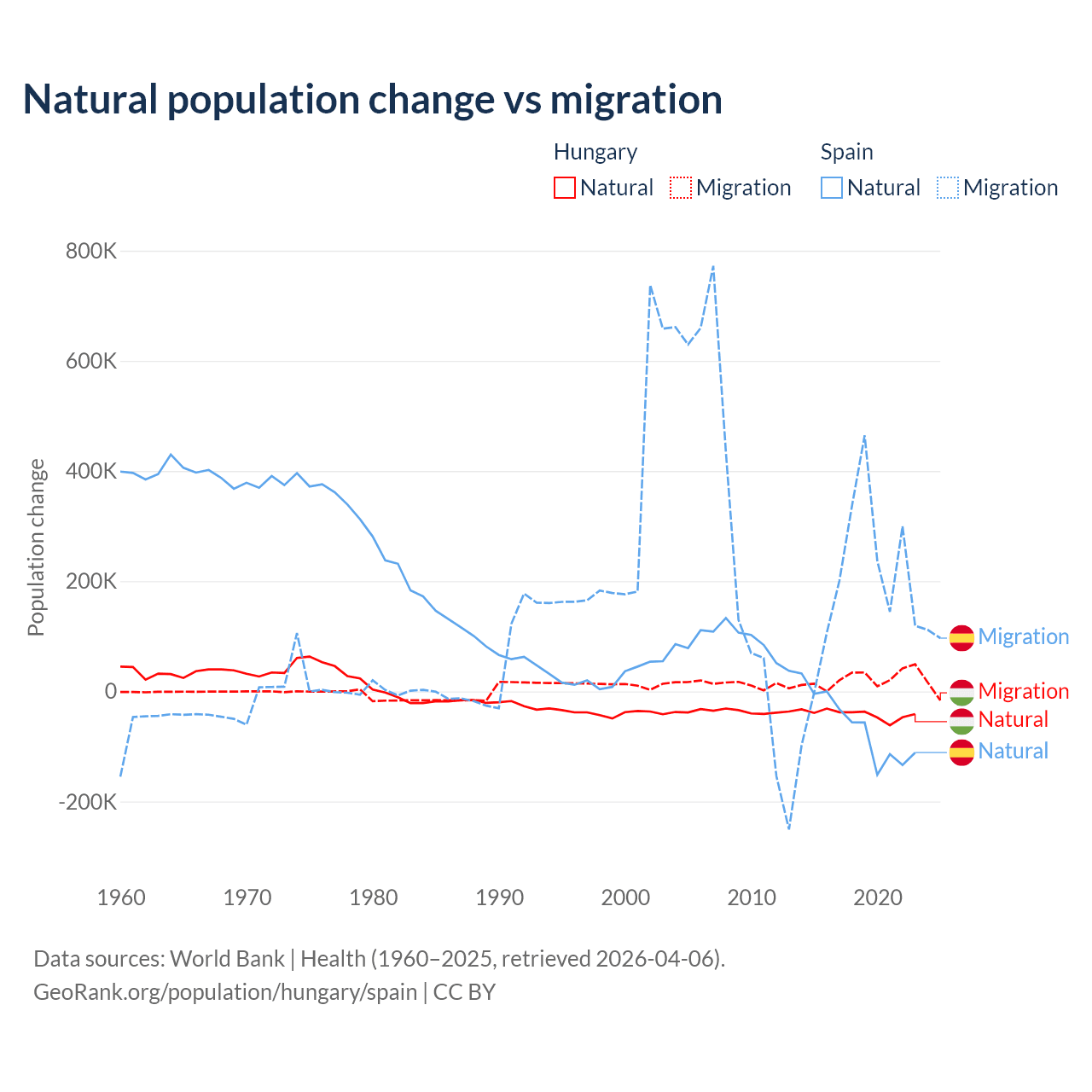 Over the last 10 years, 63.7% of the population change in Hungary is from natural causes (a loss of 412,838 people) and 36.3% is from migration (a gain of 234,837 people). In Spain 25.8% is from natural causes (a loss of 627,829 people) and 74.2% is from migration (a gain of 1,810,127 people).