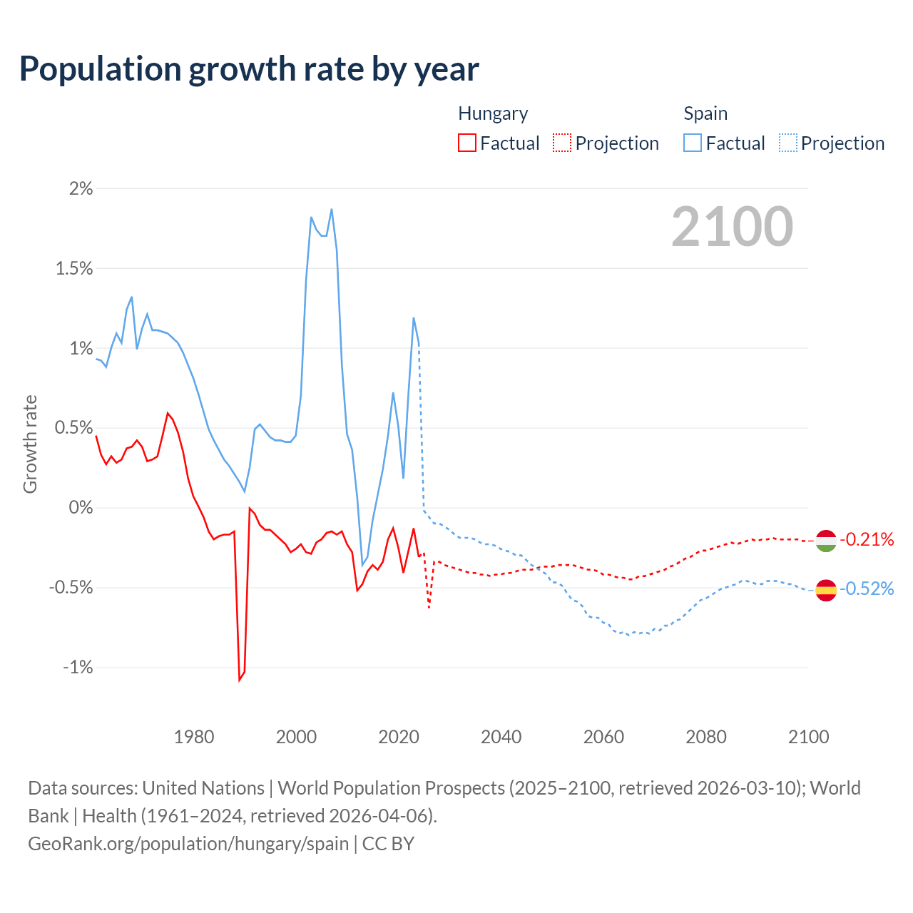 - For the last 10 years, Hungary has had an average growth rate of -0.29% per year vs +0.43% in Spain.