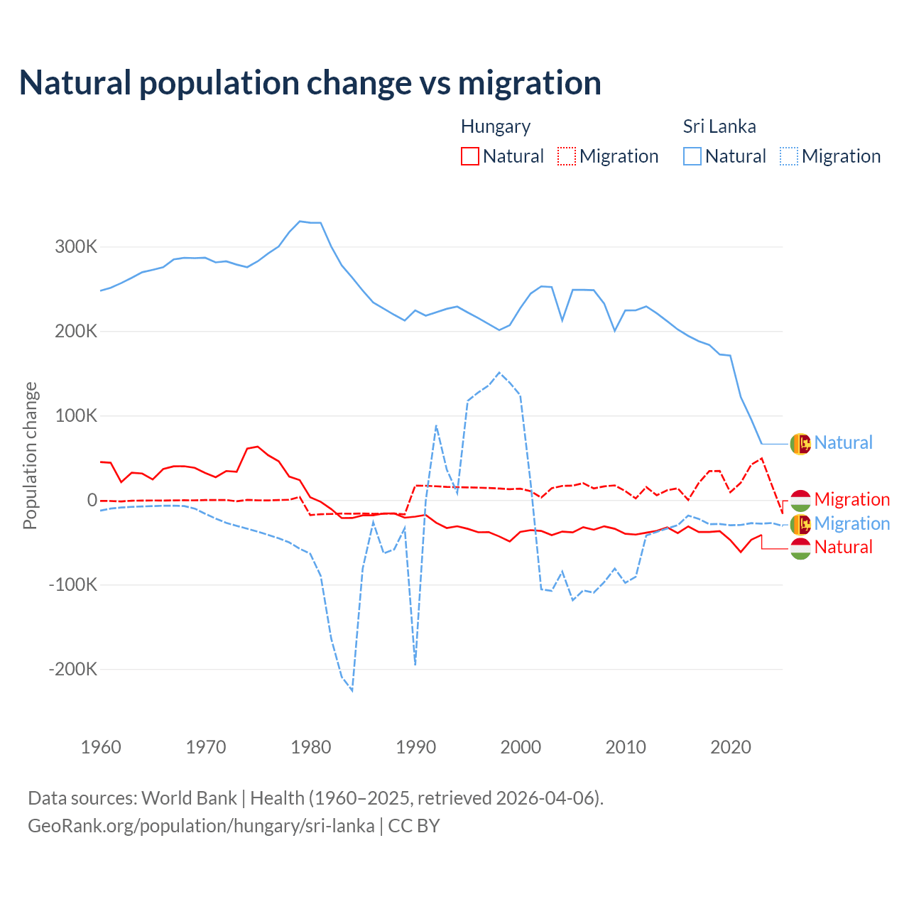 Over the last 10 years, 63.7% of the population change in Hungary is from natural causes (a loss of 412,838 people) and 36.3% is from migration (a gain of 234,837 people). In Sri Lanka 85.3% is from natural causes (a gain of 1,605,749 people) and 14.7% is from migration (a loss of 276,121 people).