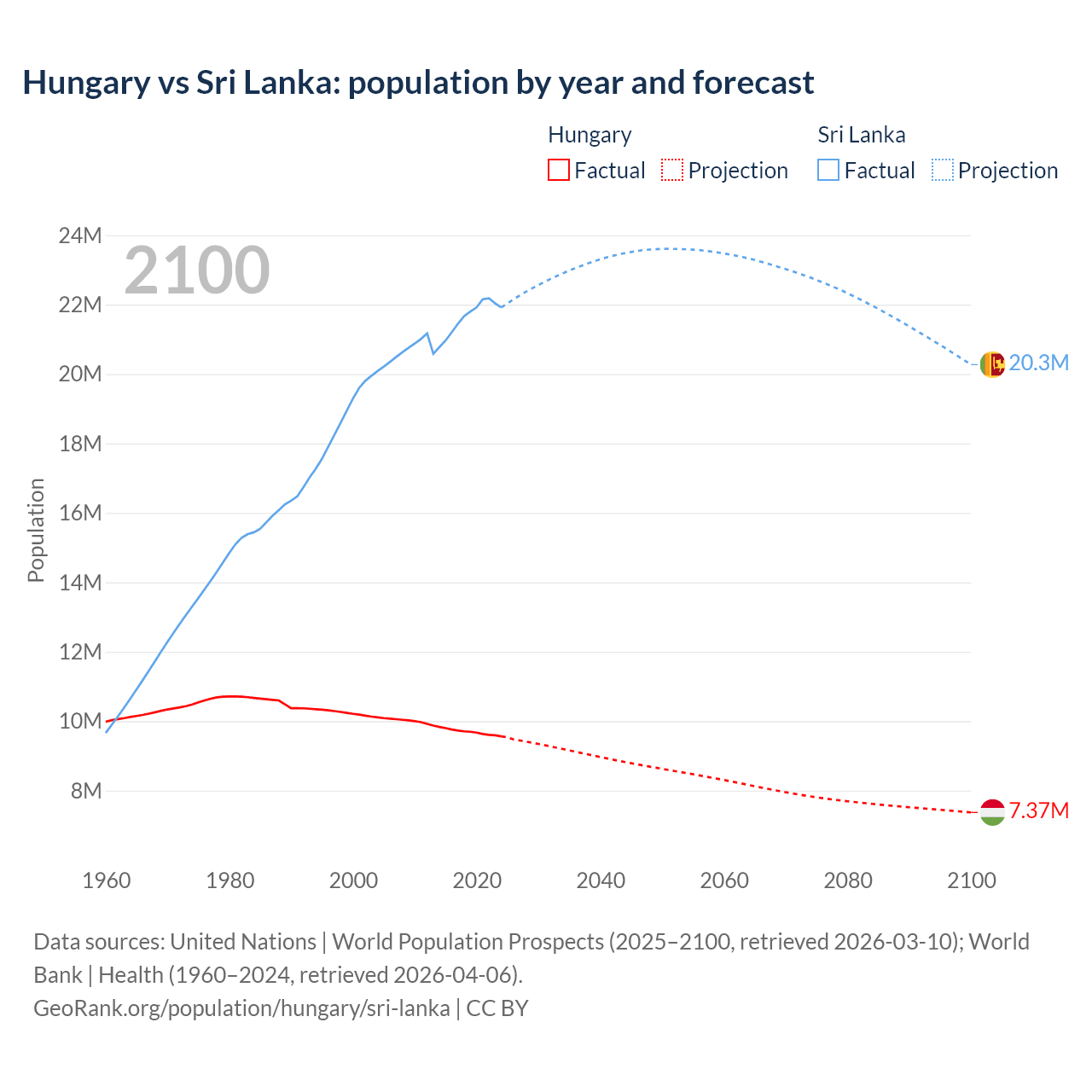 - Since 2006, the population of Hungary has decreased from 10.1M people to 9.48M (5.92% decline), while Sri Lanka has grown from 20.4M to 22.2M (9.01% growth).