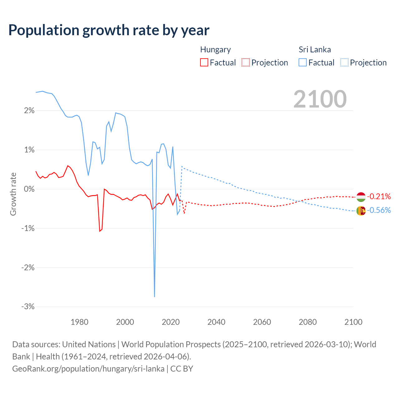 - For the last 10 years, Hungary has had an average growth rate of -0.29% per year vs +0.57% in Sri Lanka.