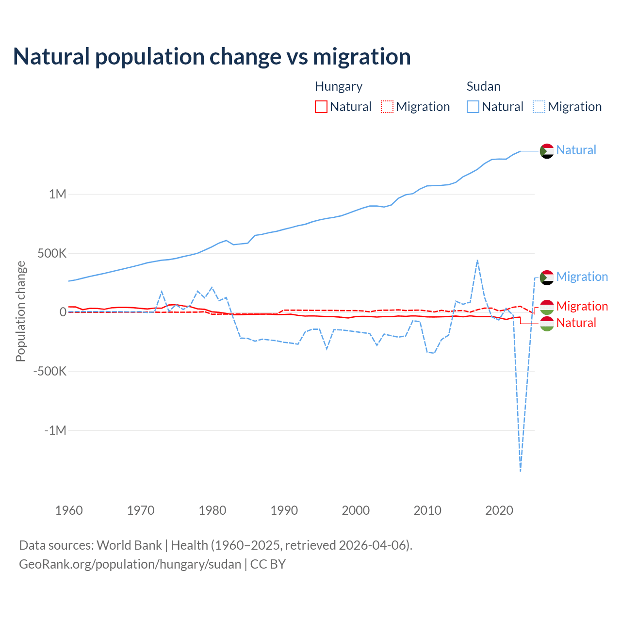 Over the last 10 years, 63.7% of the population change in Hungary is from natural causes (a loss of 412,838 people) and 36.3% is from migration (a gain of 234,837 people). In Sudan 95.1% is from natural causes (a gain of 12,459,977 people) and 4.88% is from migration (a loss of 639,596 people).