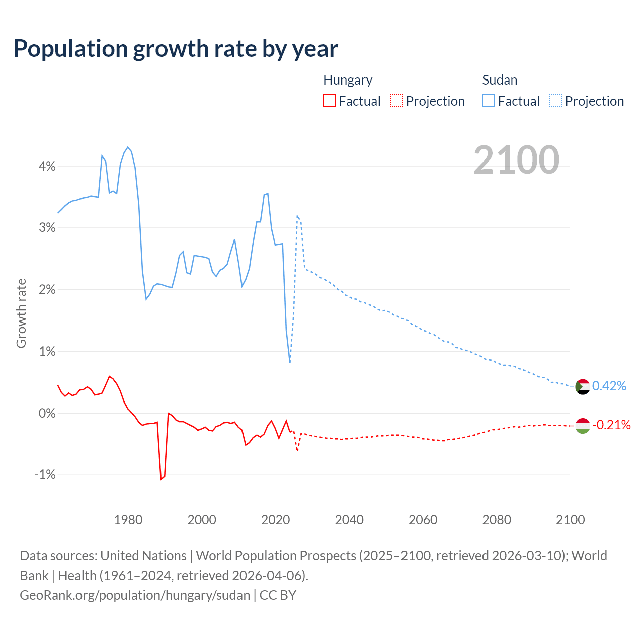 - For the last 10 years, Hungary has had an average growth rate of -0.29% per year vs +2.67% in Sudan.