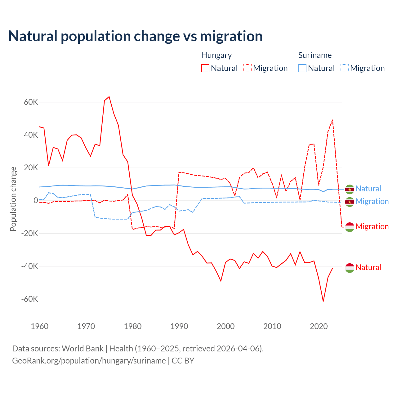 Over the last 10 years, 63.7% of the population change in Hungary is from natural causes (a loss of 412,838 people) and 36.3% is from migration (a gain of 234,837 people). In Suriname 90.3% is from natural causes (a gain of 66,709 people) and 9.72% is from migration (a loss of 7,185 people).