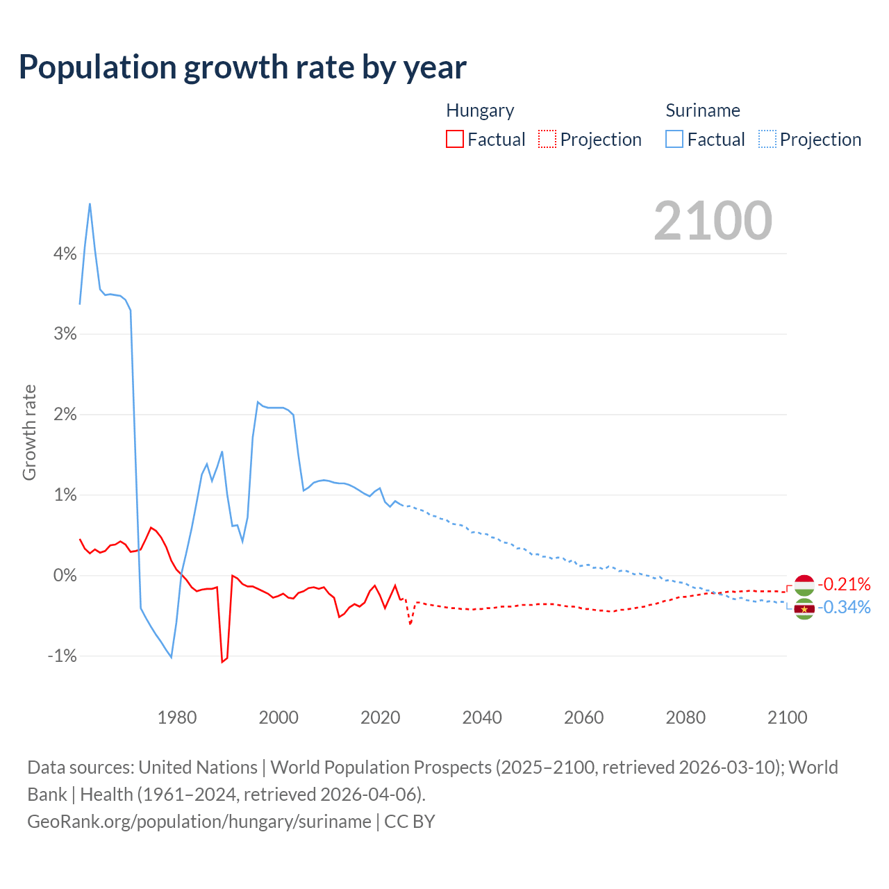 - For the last 10 years, Hungary has had an average growth rate of -0.29% per year vs +0.99% in Suriname.