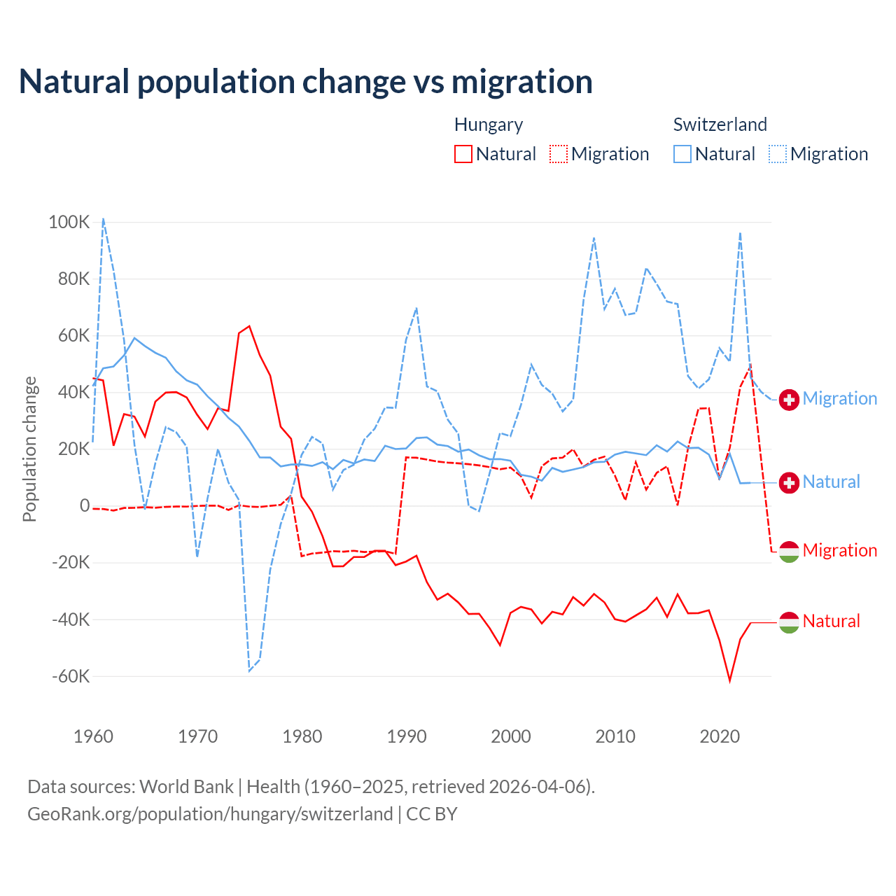 Over the last 10 years, 63.7% of the population change in Hungary is from natural causes (a loss of 412,838 people) and 36.3% is from migration (a gain of 234,837 people). In Switzerland 21.6% is from natural causes (a gain of 165,354 people) and 78.4% is from migration (a gain of 600,145 people).