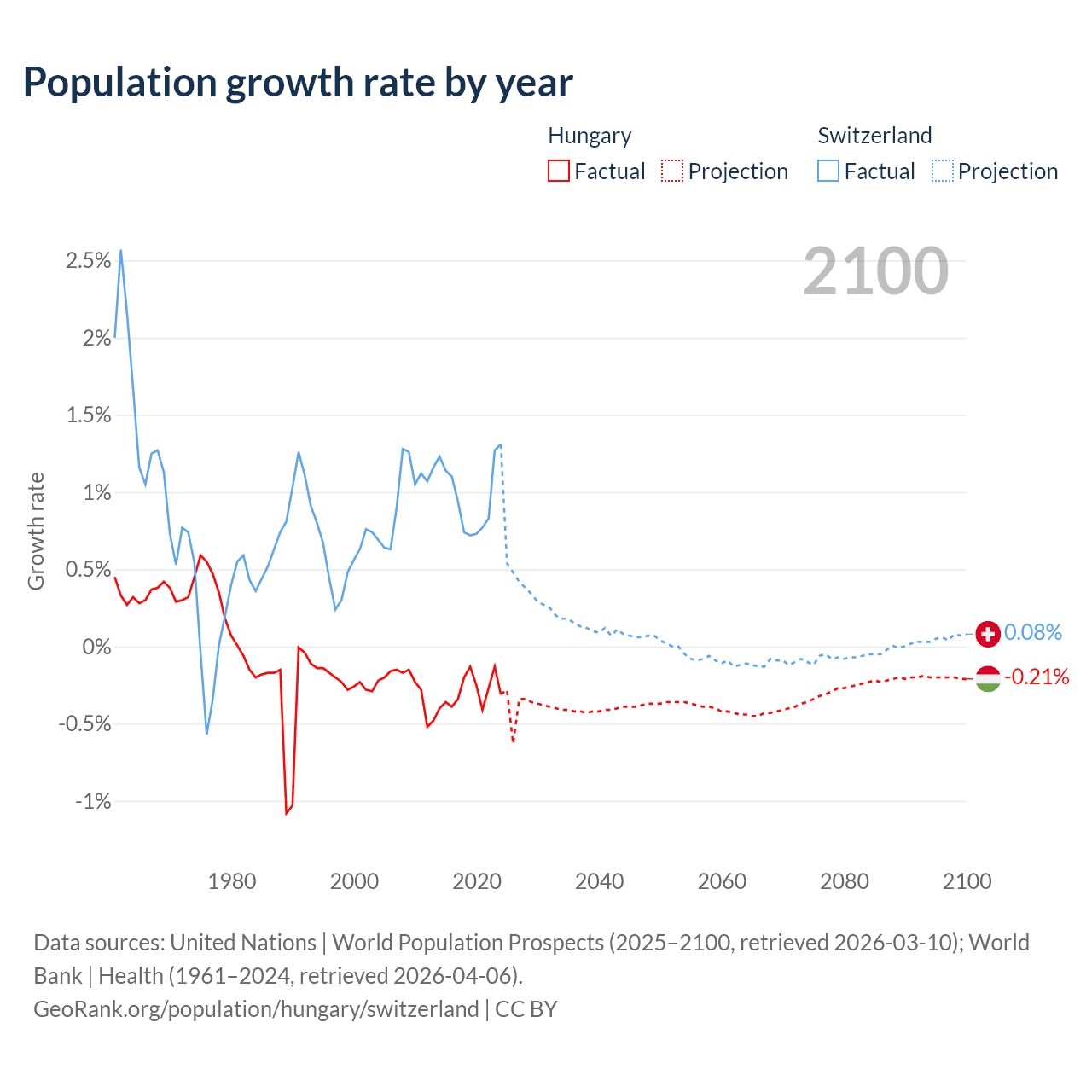- For the last 10 years, Hungary has had an average growth rate of -0.29% per year vs +0.98% in Switzerland.