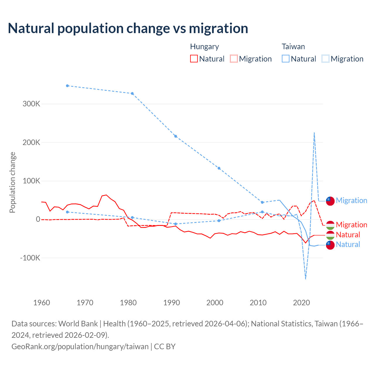 Over the last 10 years, 63.7% of the population change in Hungary is from natural causes (a loss of 412,838 people) and 36.3% is from migration (a gain of 234,837 people). In Taiwan 56.7% is from natural causes (a loss of 57,467 people) and 43.3% is from migration (a gain of 43,884 people).