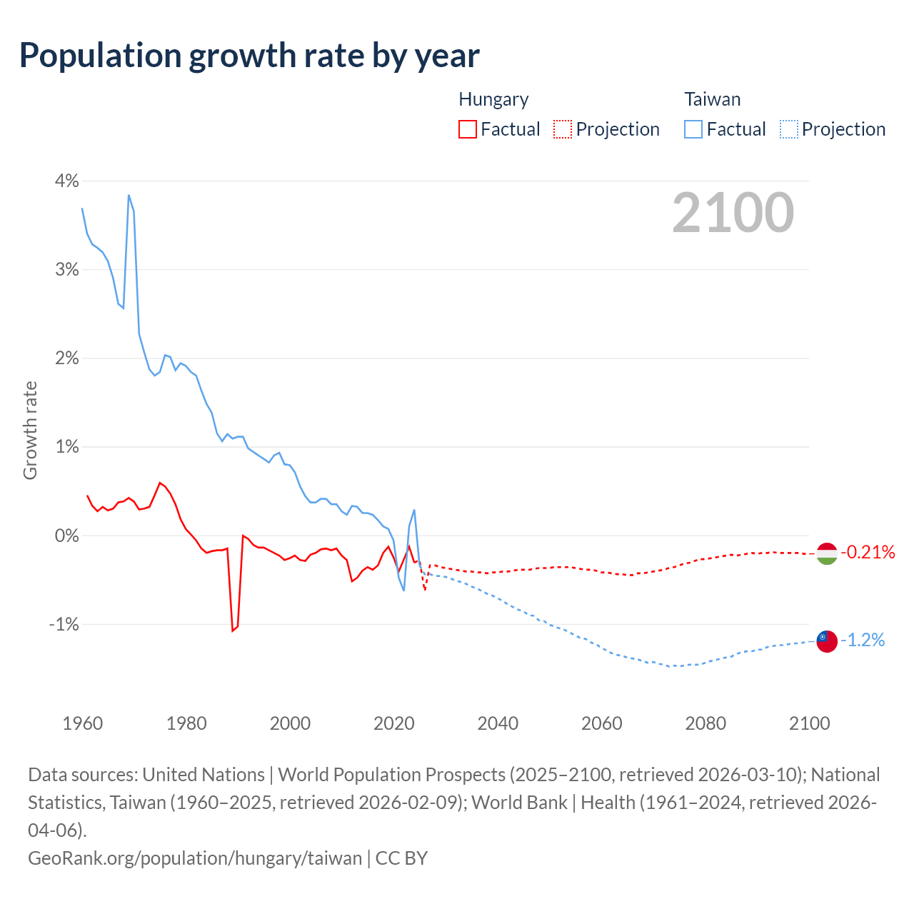 - For the last 10 years, Hungary has had an average growth rate of -0.29% per year vs -0.03% in Taiwan.