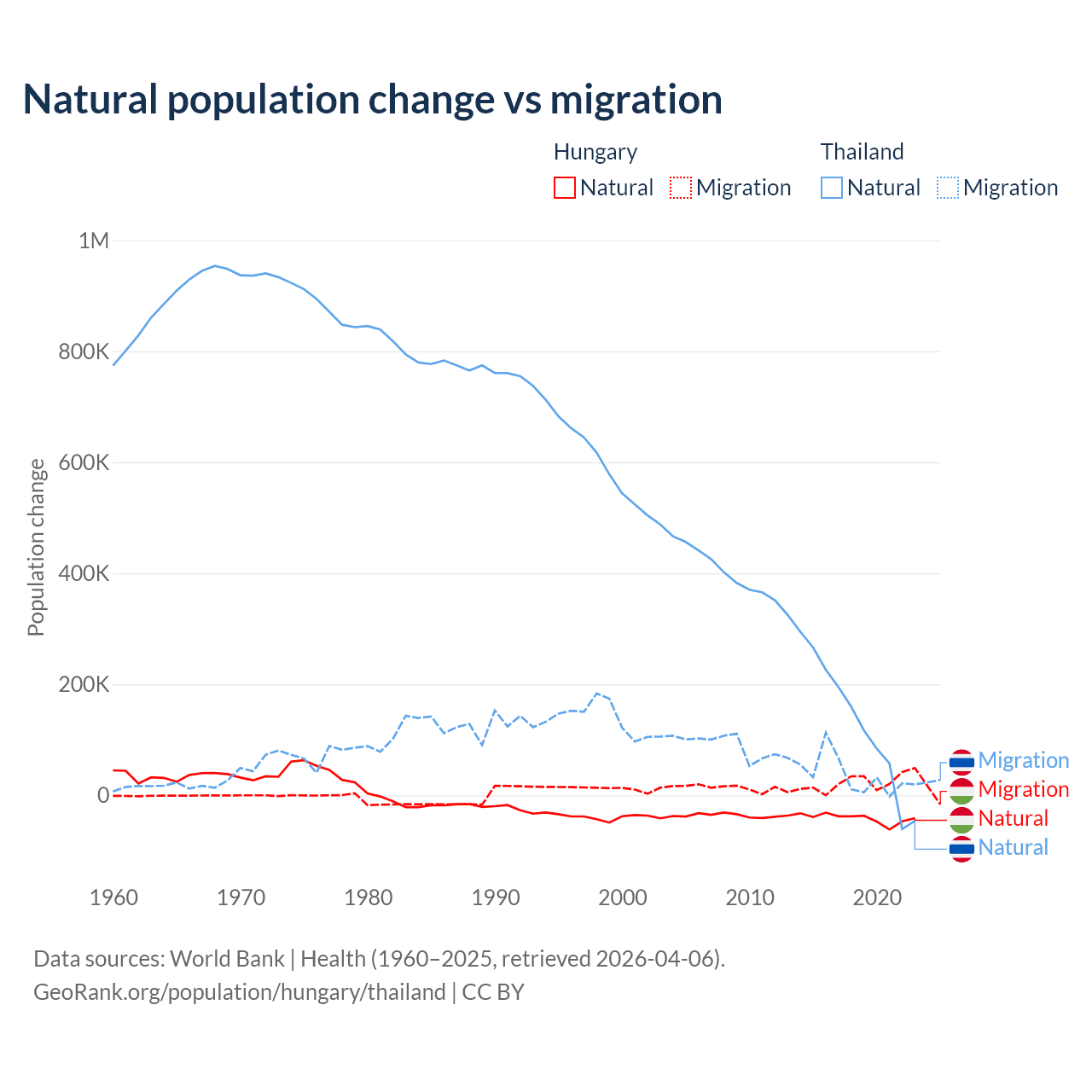 Over the last 10 years, 63.7% of the population change in Hungary is from natural causes (a loss of 412,838 people) and 36.3% is from migration (a gain of 234,837 people). In Thailand 78.4% is from natural causes (a gain of 1,292,528 people) and 21.6% is from migration (a gain of 355,361 people).