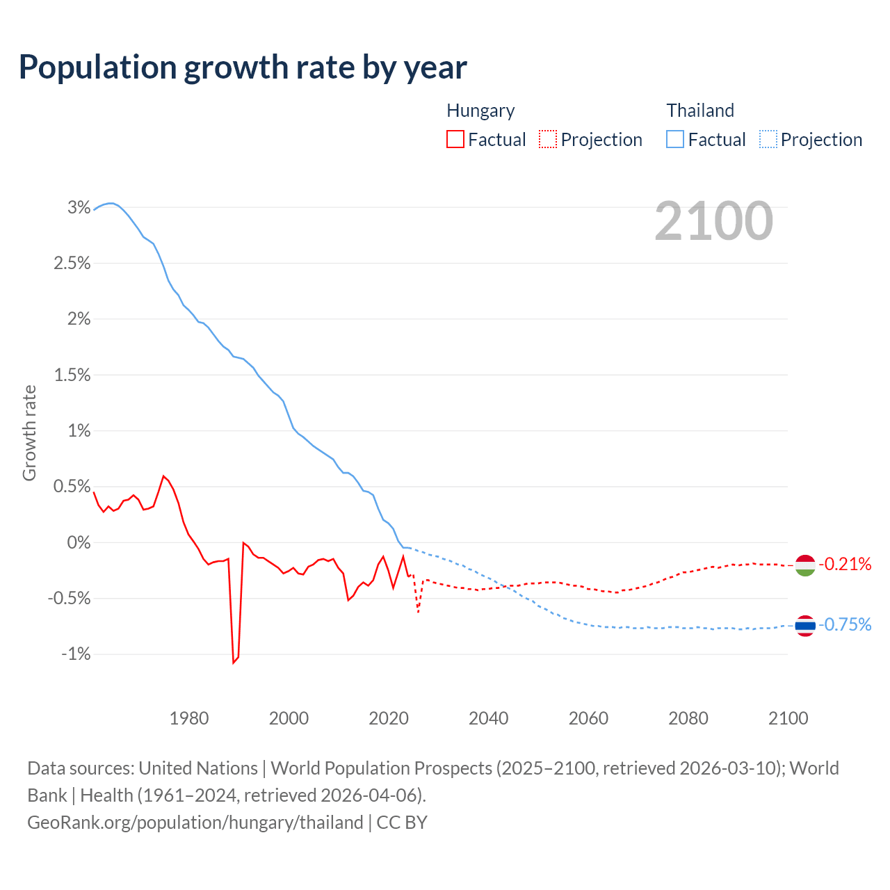 - For the last 10 years, Hungary has had an average growth rate of -0.29% per year vs +0.23% in Thailand.