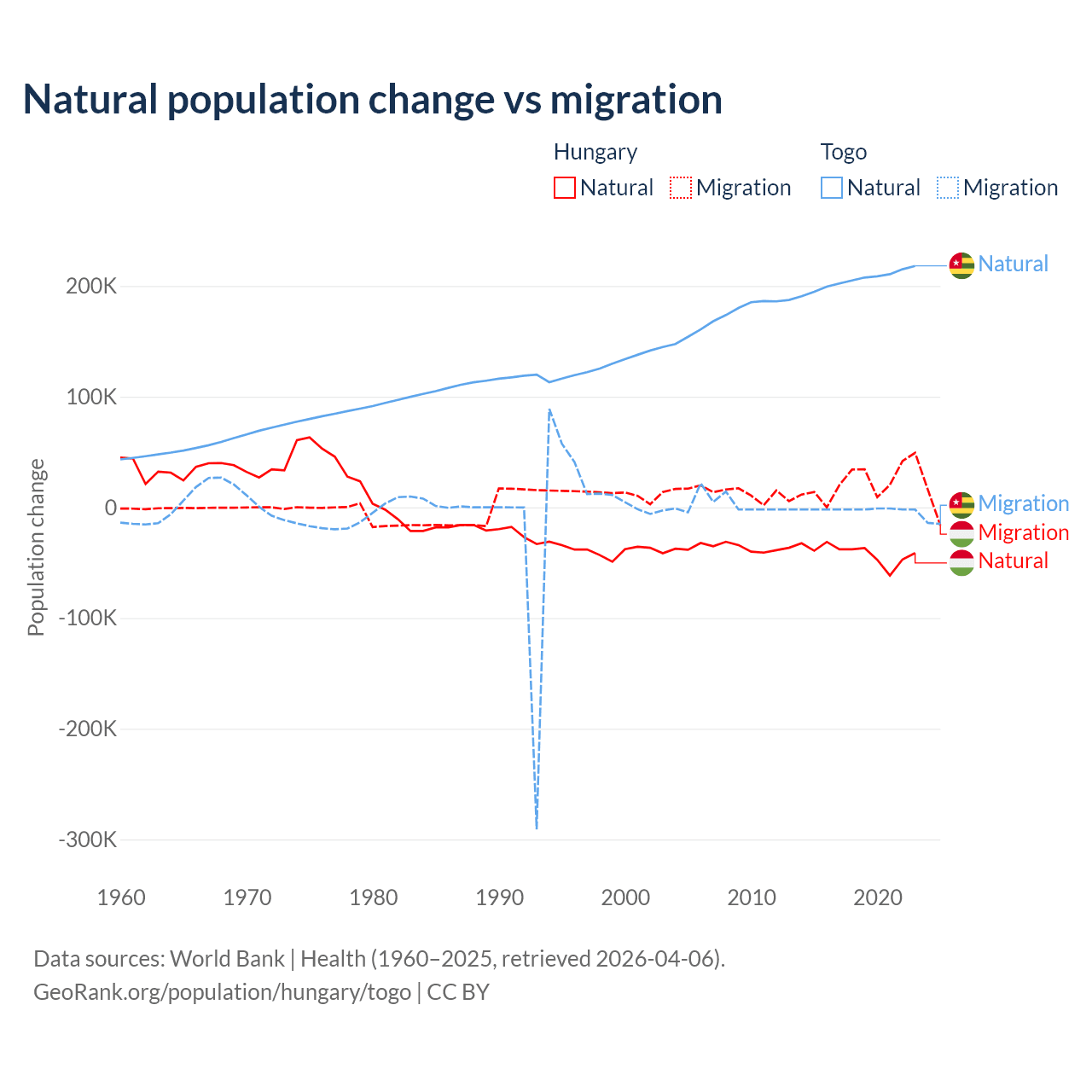 Over the last 10 years, 63.7% of the population change in Hungary is from natural causes (a loss of 412,838 people) and 36.3% is from migration (a gain of 234,837 people). In Togo 99.1% is from natural causes (a gain of 2,052,115 people) and 0.86% is from migration (a loss of 17,852 people).