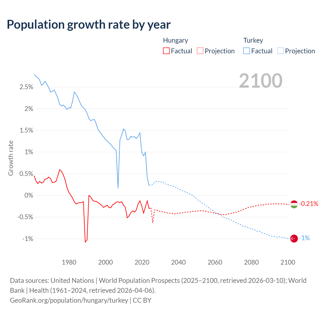 - For the last 10 years, Hungary has had an average growth rate of -0.29% per year vs +1.06% in Turkey.