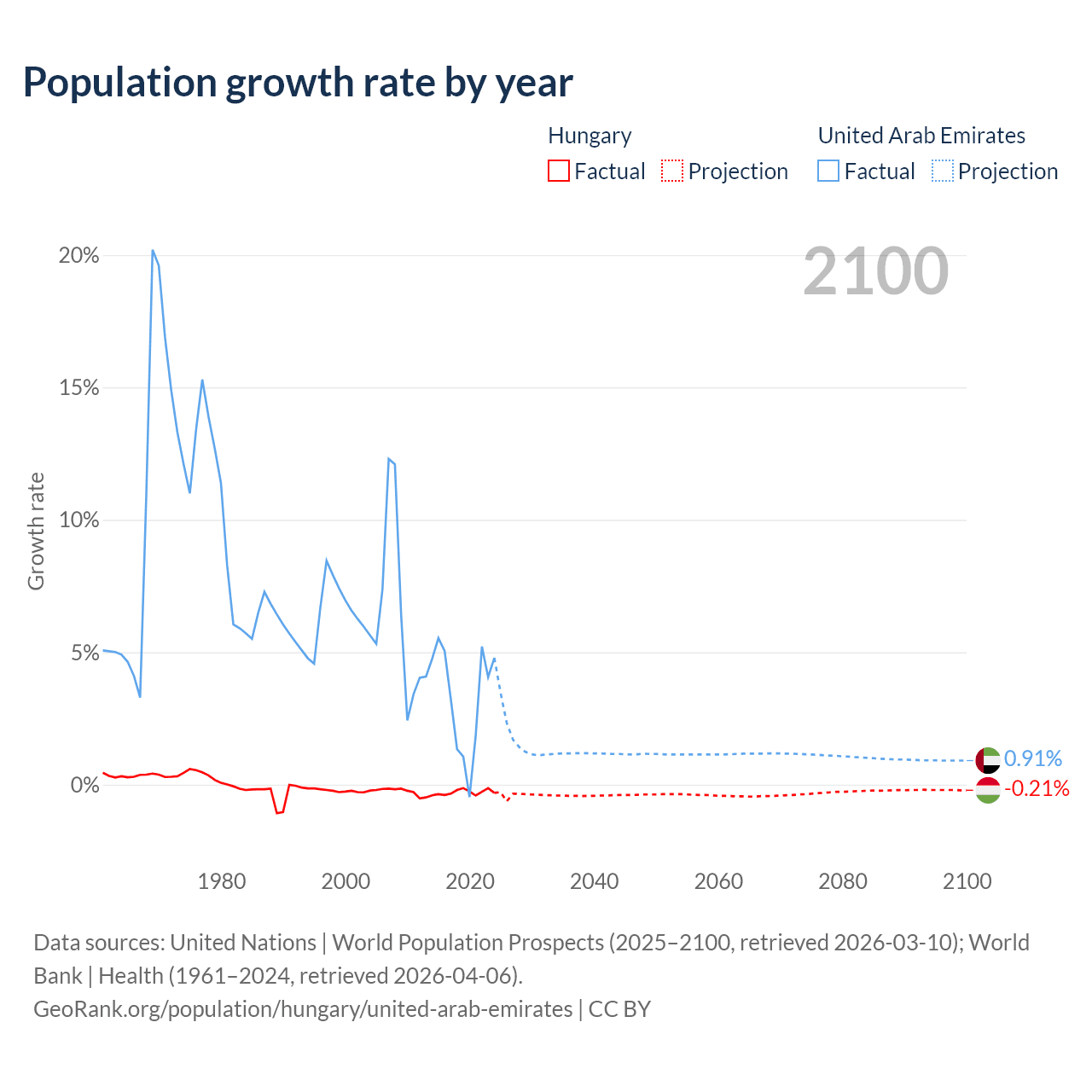 - For the last 10 years, Hungary has had an average growth rate of -0.29% per year vs +3.31% in the United Arab Emirates.