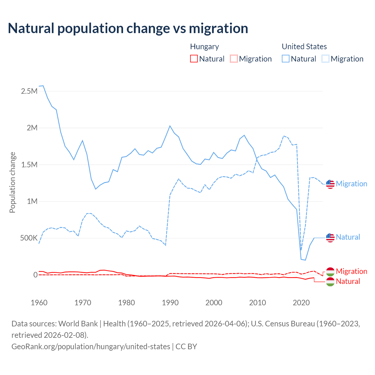 Over the last 10 years, 63.7% of the population change in Hungary is from natural causes (a loss of 412,838 people) and 36.3% is from migration (a gain of 234,837 people). In the United States 35.8% is from natural causes (a gain of 8,005,866 people) and 64.2% is from migration (a gain of 14,334,286 people).