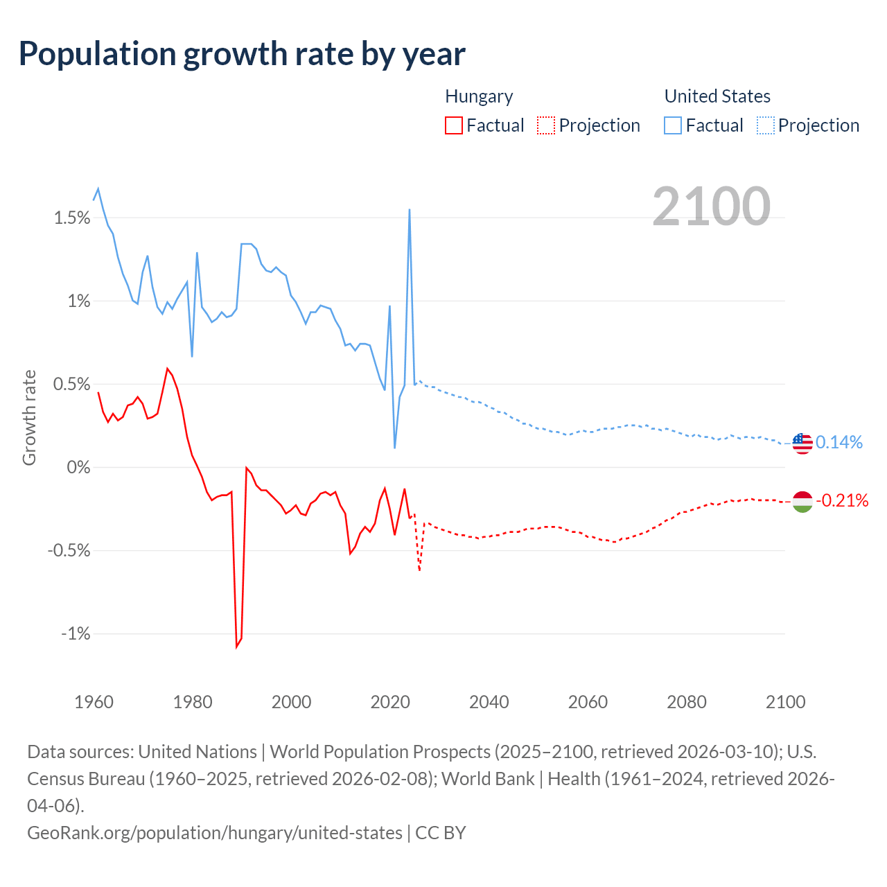 - For the last 10 years, Hungary has had an average growth rate of -0.29% per year vs +0.65% in the United States.