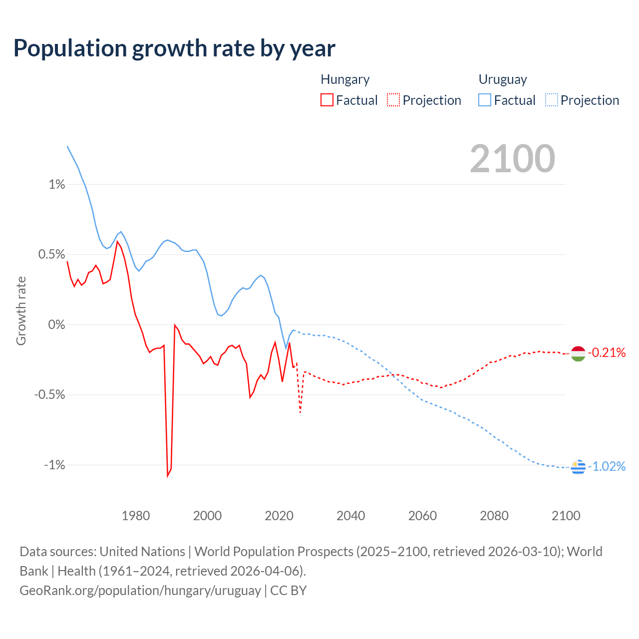 - For the last 10 years, Hungary has had an average growth rate of -0.29% per year vs +0.11% in Uruguay.