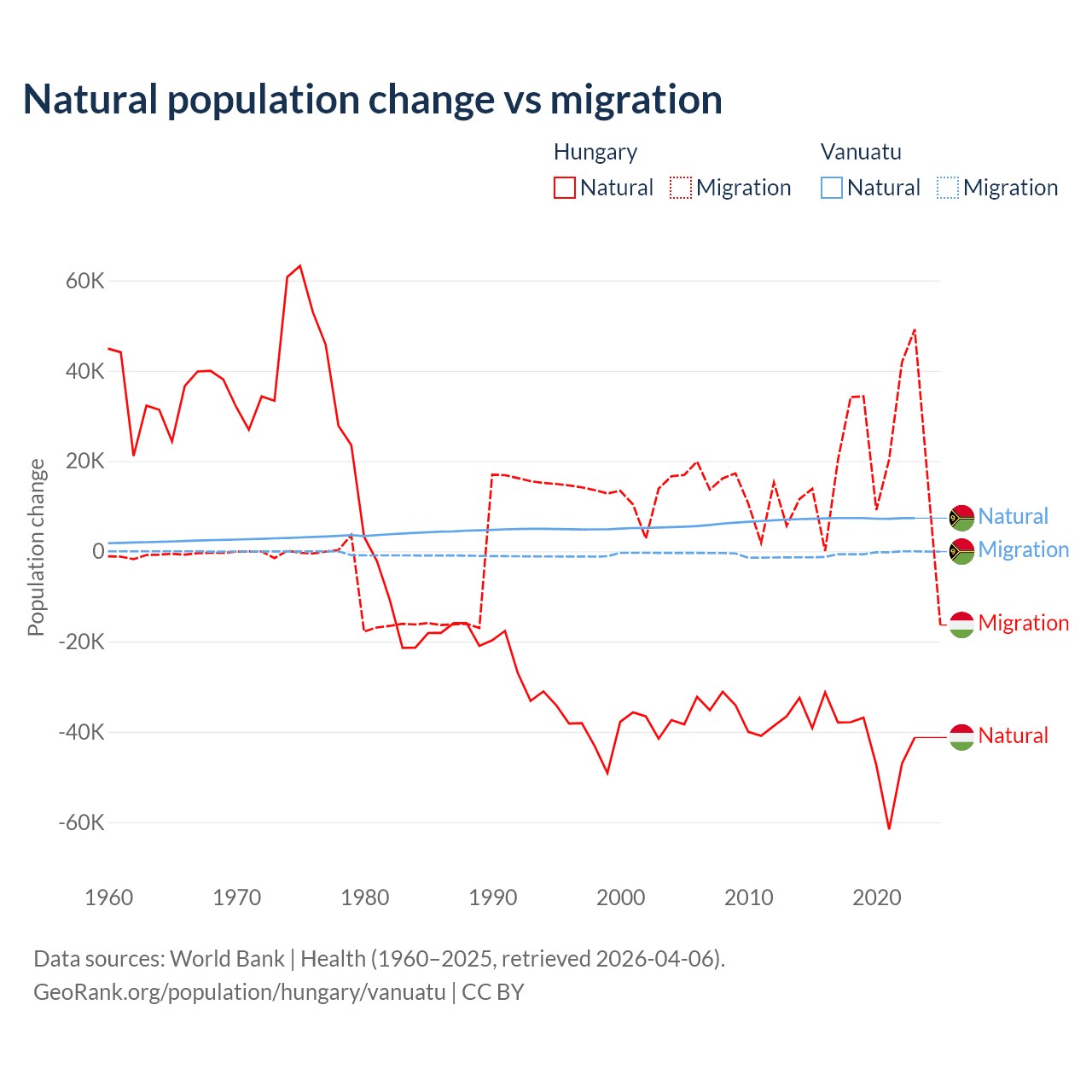 Over the last 10 years, 63.7% of the population change in Hungary is from natural causes (a loss of 412,838 people) and 36.3% is from migration (a gain of 234,837 people). In Vanuatu 92.2% is from natural causes (a gain of 72,941 people) and 7.81% is from migration (a loss of 6,181 people).