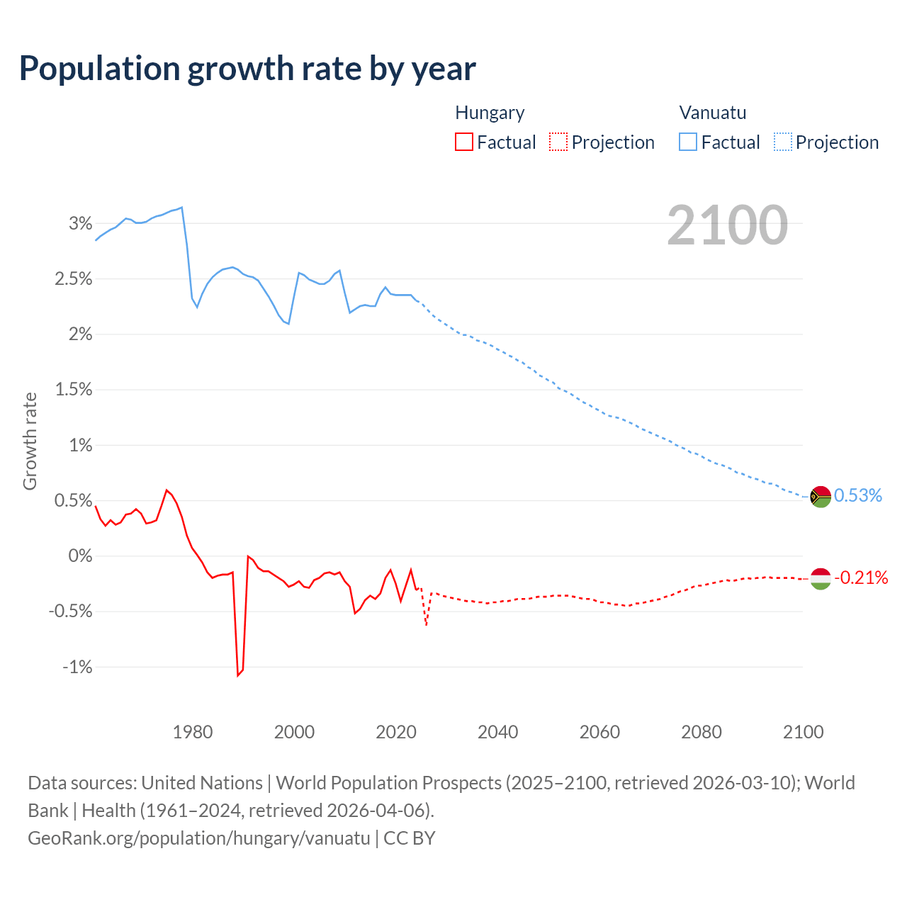 - For the last 10 years, Hungary has had an average growth rate of -0.29% per year vs +2.33% in Vanuatu.