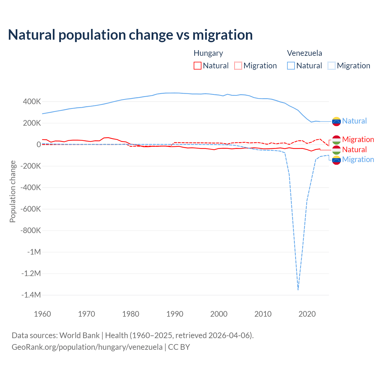 Over the last 10 years, 63.7% of the population change in Hungary is from natural causes (a loss of 412,838 people) and 36.3% is from migration (a gain of 234,837 people). In Venezuela 38.6% is from natural causes (a gain of 2,946,257 people) and 61.4% is from migration (a loss of 4,683,227 people).