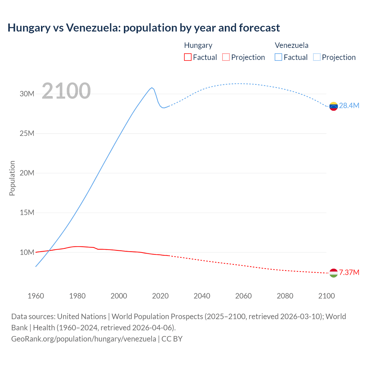 The latest officially reported population of Hungary was 9,562,065 in 2024 vs 28,405,543 people in Venezuela in 2024. In 2026, based on the adjusted UN estimation, the current Hungary's population is 9,475,525 people compared to 28,661,242 in Venezuela.