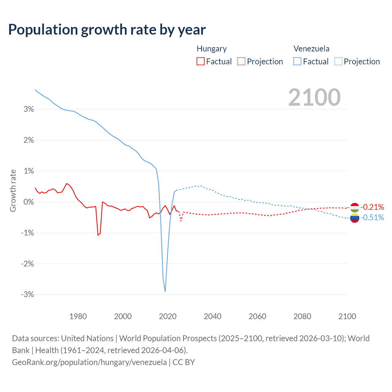 - For the last 10 years, Hungary has had an average growth rate of -0.29% per year vs -0.46% in Venezuela.